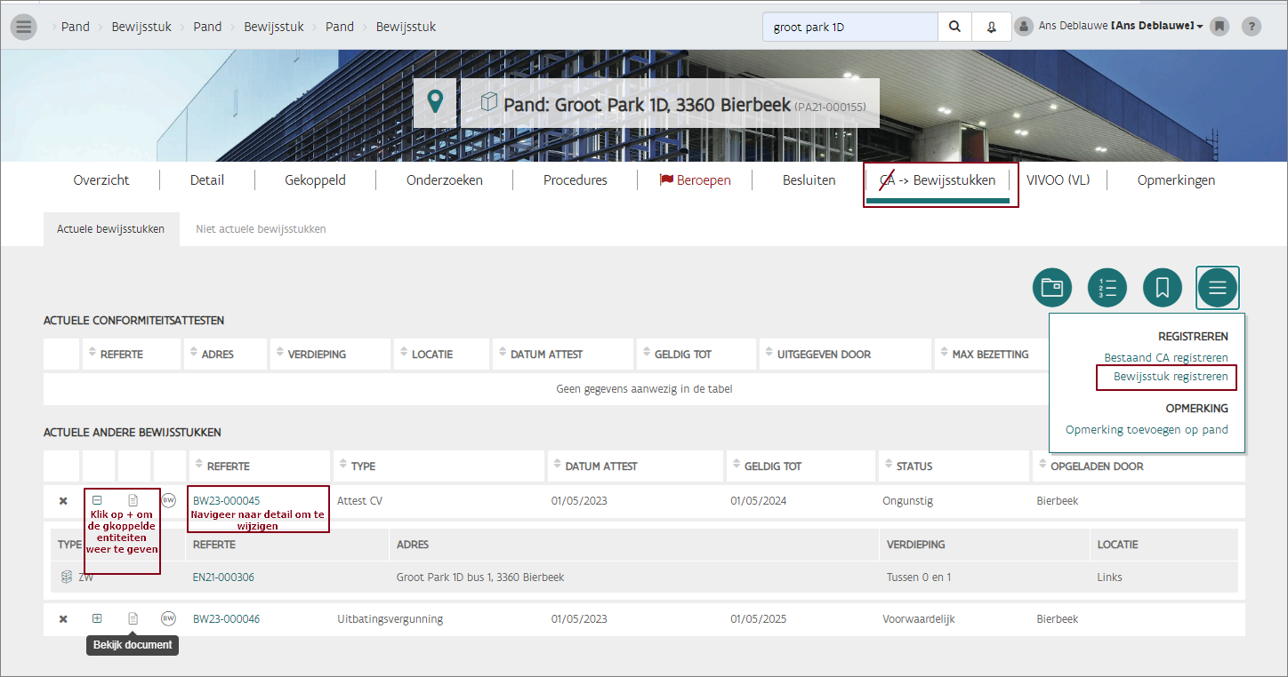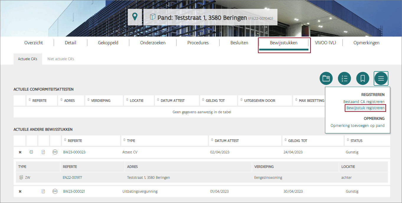 Navigeer naar Pand > Bewijsstukken en klik op de actie Bewijsstuk registreren via