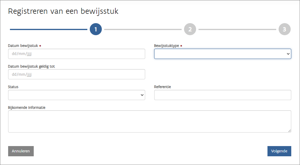• Datum bewijsstuk is verplicht en geeft aan vanaf wanneer het bewijsstuk geldig is. De vroegst mogelijke datum is 1/1/1962