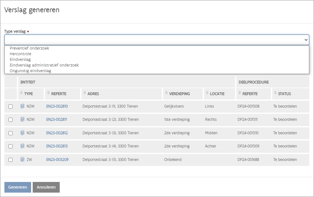 Selecteer de deelprocedures (entiteiten Een entiteit is een deel van een pand. Er zijn 3 entiteitstypes: niet-woonfunctie (NWF), een niet-zelfstandige woning (NZW) en een zelfstandige woning (ZW). Zie voor uitgebreide definitie' Hoe voeg ik een nieuwe entiteit toe?') waarvoor u het verslag wilt maken. U kunt filteren op eigenaars.