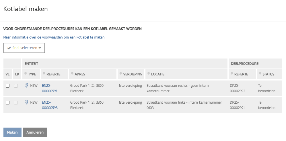 Selecteer de gewenste kotlabels/bewijsstukken. Vink de gewenste labels aan die u wilt maken / weigeren: