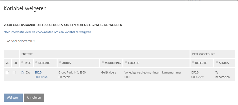 Ga naar Pand Elk bebouwd onroerend goed dat zowel het hoofdgebouw als de bijgebouwen omvat (= gebouwen die als 1 geheel beschouwd kunnen worden), met uitzondering van bedrijfsruimten. Een pand kan één of meerdere zelfstandige en/of niet-zelfstandige entiteiten bevatten met of zonder woonfunctie. > Procedures kotlabel (referte) > Detail en klik op de actie Kotlabel maken/weigeren via De acties zijn enkel mogelijk in lopende procedures.