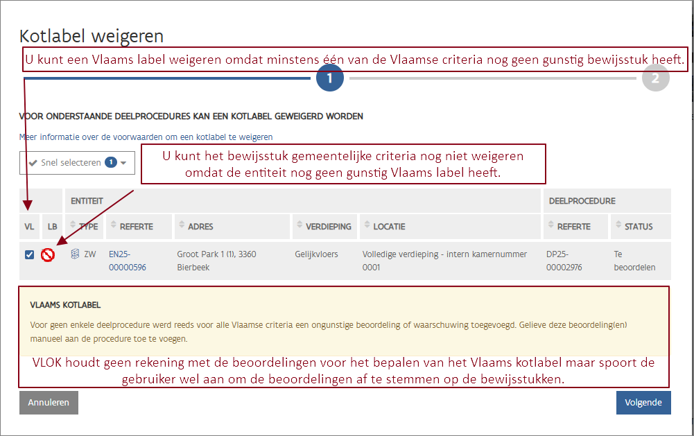 Als u een kotlabel weigert zal VLOK bewijsstukken van hetzelfde type waarbinnen de entiteit gekoppeld is, vervallen zetten met reden verval 'Nieuw bewijsstuk Vlaams kotlabel/gemeentelijke criteria studentenhuisvesting'.