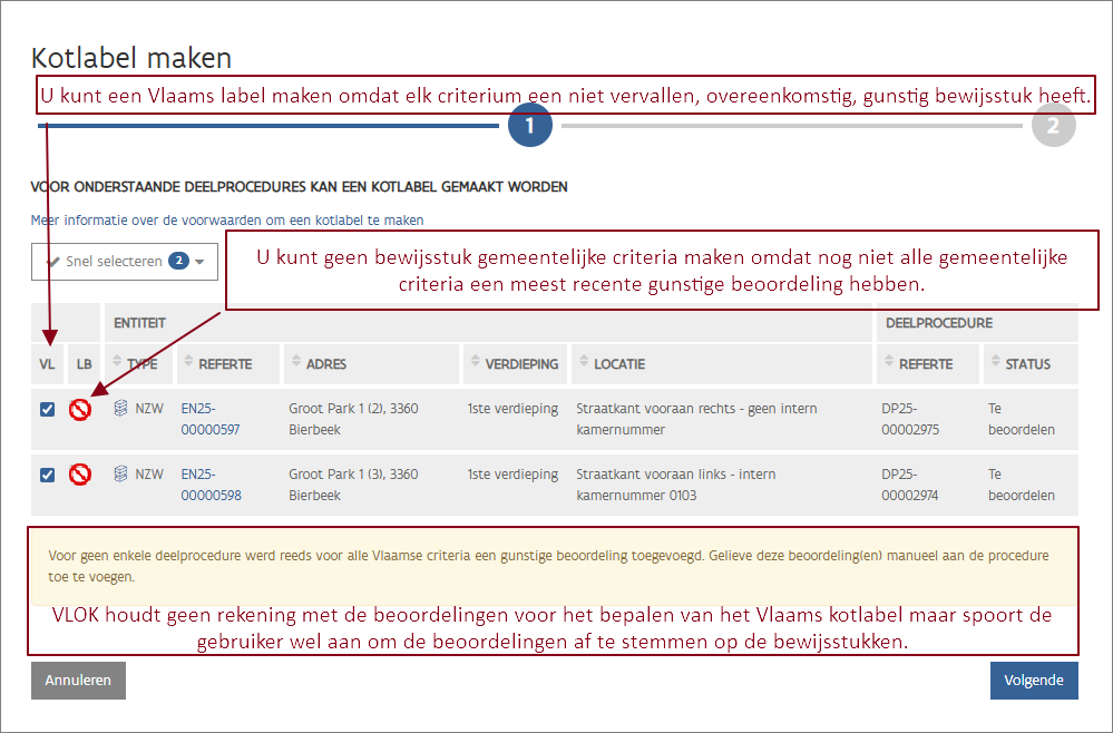 aanmaken indien het Vlaamse kotlabel is aangemaakt of mogelijk is en de entiteit voor de gemeentelijke criteria als meest recente beoordeling gunstig heeft. VLOK houdt geen rekening met de aanduidingen.