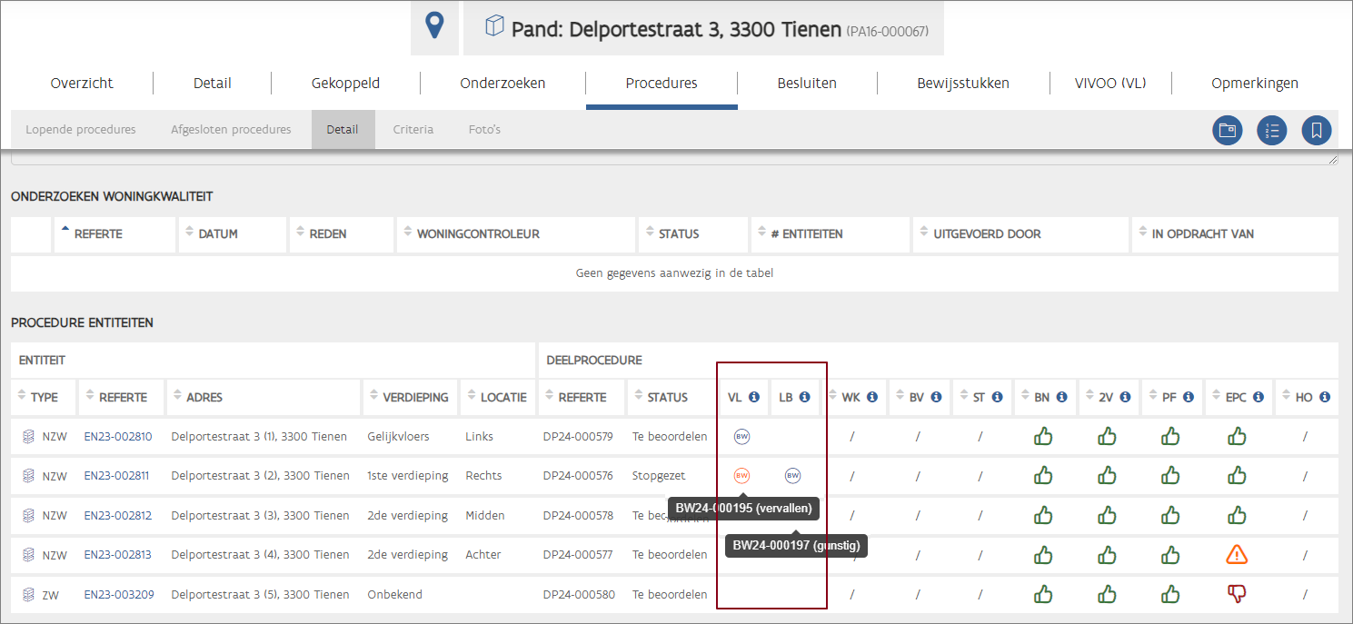 U vindt de kotlabelbewijsstukken terug onder Pand / Entiteit bewijsstukken of in het overzicht Pand > Procedures > Detail onder de kolommen VL (Vlaams kotlabel) en LB (bewijsstuk 'Gemeentelijke criteria studentenhuisvesting').
