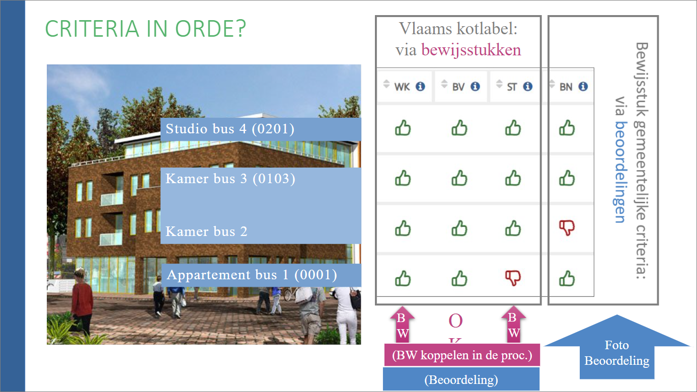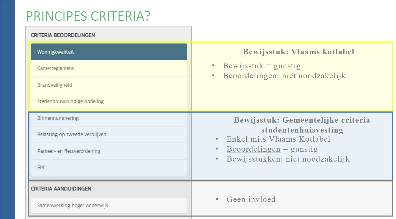 Het bewijsstuk 'Gemeentelijke criteria studentenhuisvesting' kan dus enkel bestaan (gunstig of ongunstig) samen met een gunstig Vlaams kotlabel.