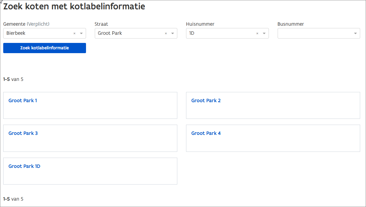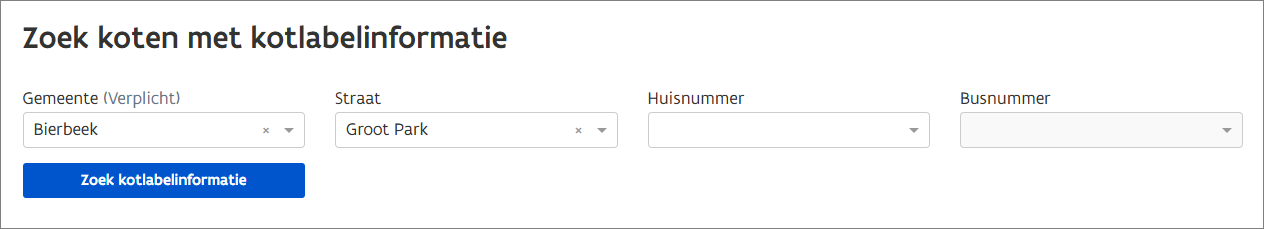 Geef minstens de Hoofdgemeente op en verfijn eventueel met Straat, Huisnummer en Busnummer.