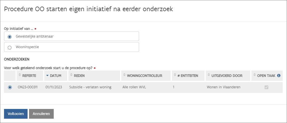 De dossierbeheerder woningkwaliteit (Wonen) gebruikt deze optie bij een taak 126 of taak 458 start procedure OO omdat een onderzoek huursubsidie, woonmaatschappij of gerechtelijk onderzoek niet-conforme woningen bevat
