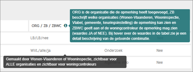 De zichtbaarheid is in het overzicht van de opmerkingen verduidelijkt via de nieuwe waarde ZBWC (zichtbaarheid woningcontroleur). Hover over de getoonde combinatie voor een detailomschrijving.