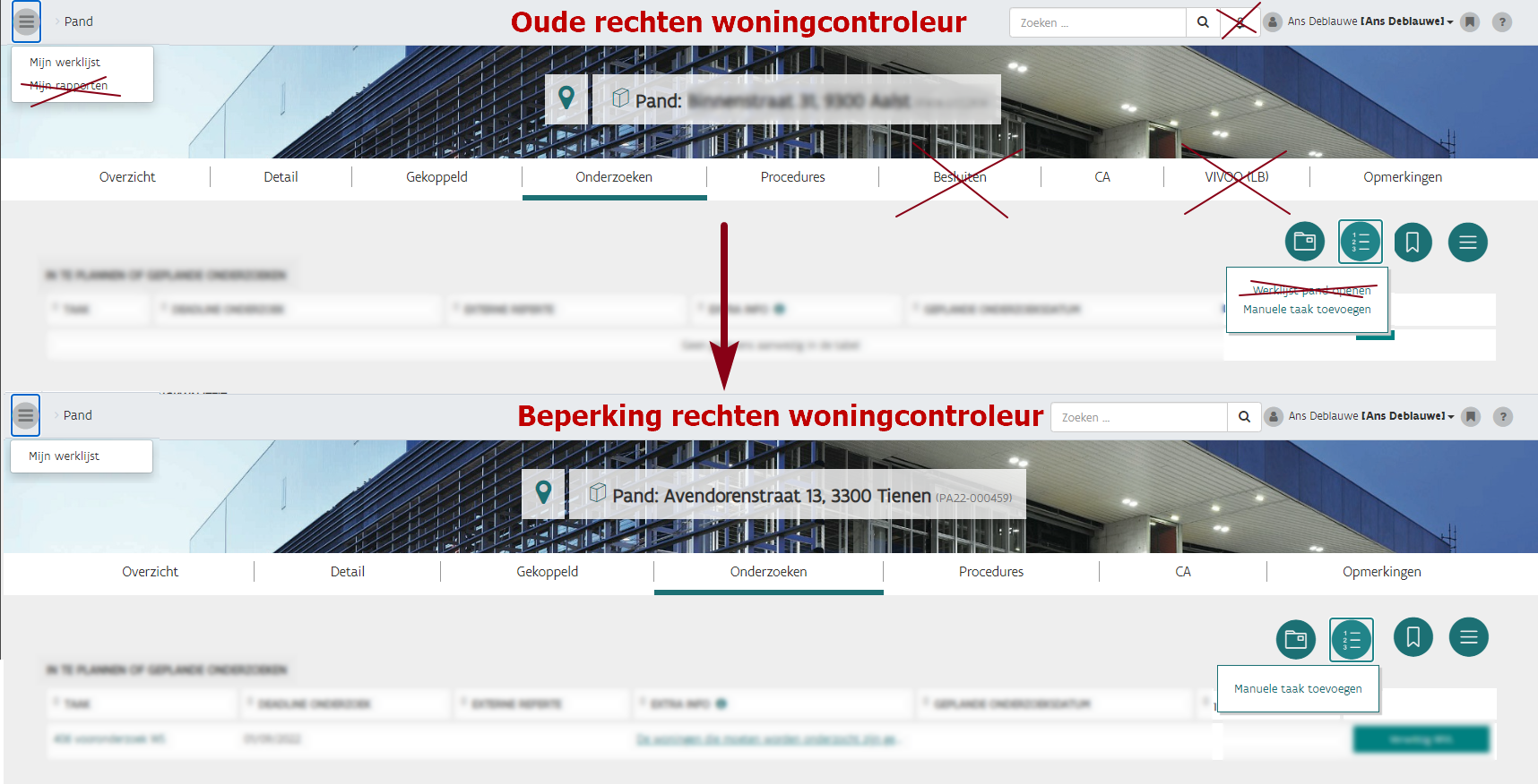 Omdat de groep woningcontroleurs uitbreidt via de erkende keuringsinstellingen zijn de privacyvereisten strikter om de privacy te waarborgen van de betrokkenen bij procedures. Daarom zijn de rechten van alle woningcontroleurs gewijzigd naar de minimale rechten nodig om uw job als woningcontroleur te kunnen uitvoeren.