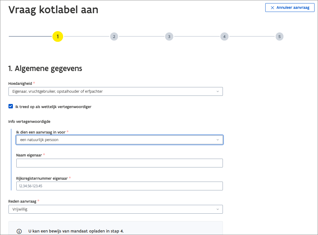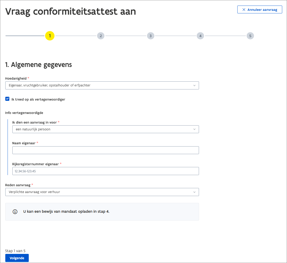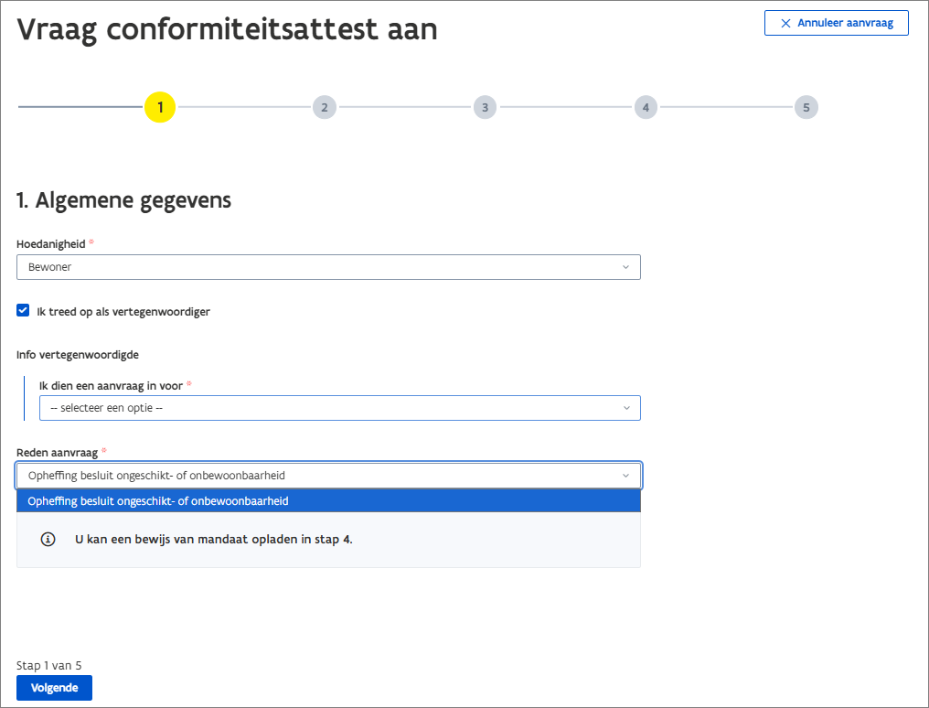 Als u als indiener de HZR / bewoner vertegenwoordigt, kunt u dit aanvinken in stap 1 van de aanvraag en de gegevens van de vertegenwoordigde ingeven.