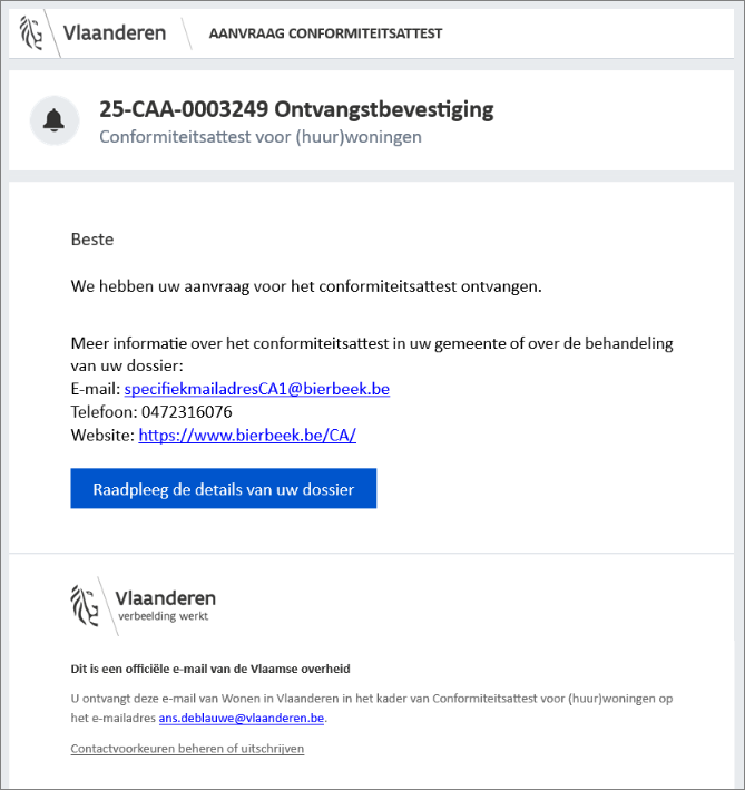 Na indienen van de aanvraag ontvangt de indiener een automatische ontvangstbevestiging.