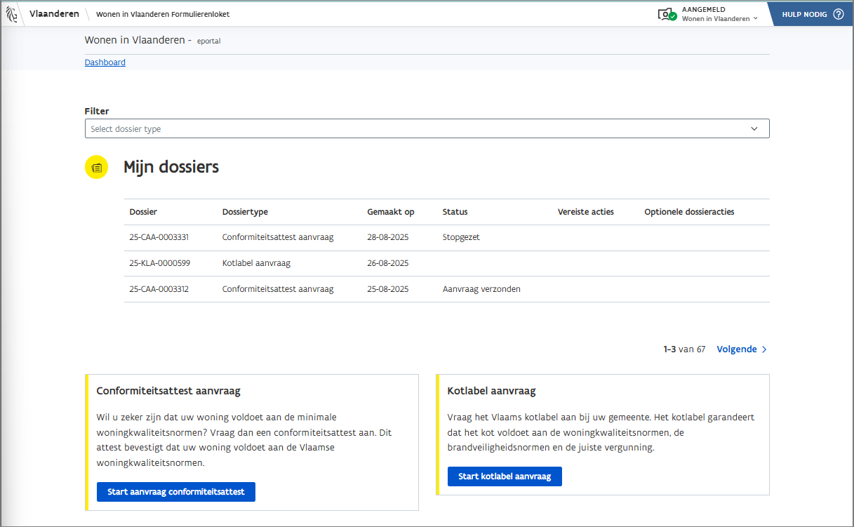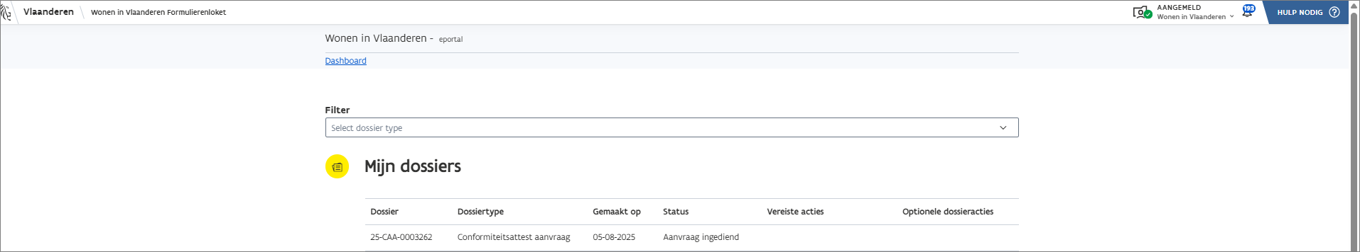 • In het burgerprofiel / E-loket ondernemers kan de indiener naar hetzelfde dossier navigeren via Aanvragen en dossiers: