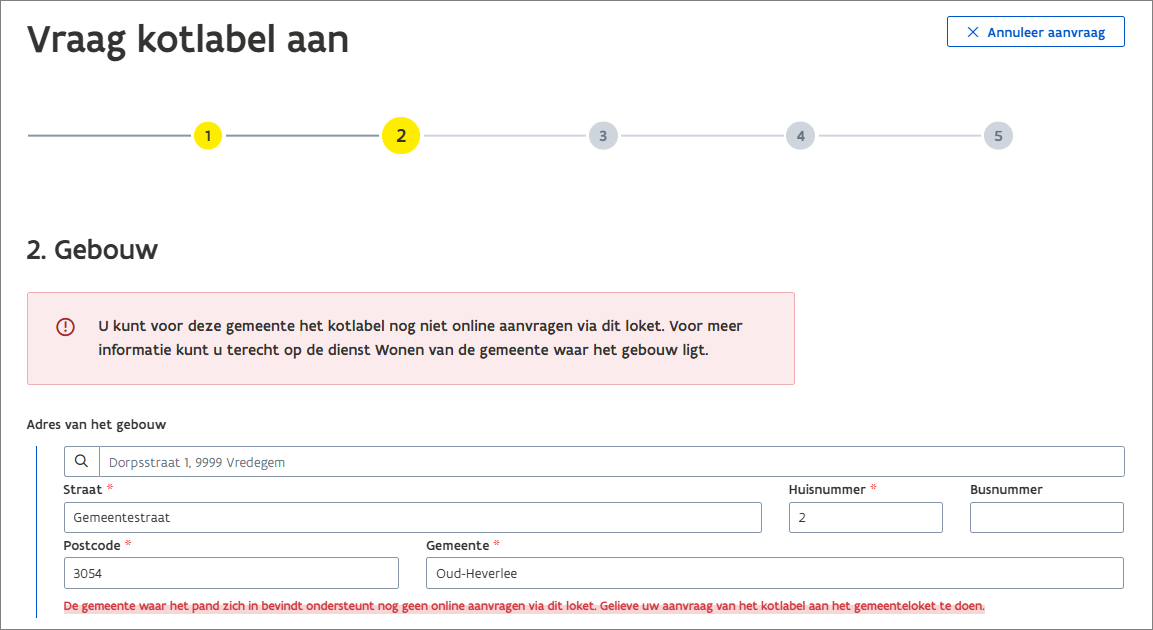 Als uw gemeente een bepaald formulier niet aanbiedt, krijgt u volgende rode foutmelding bij het ingeven van het adres via dat formulier: