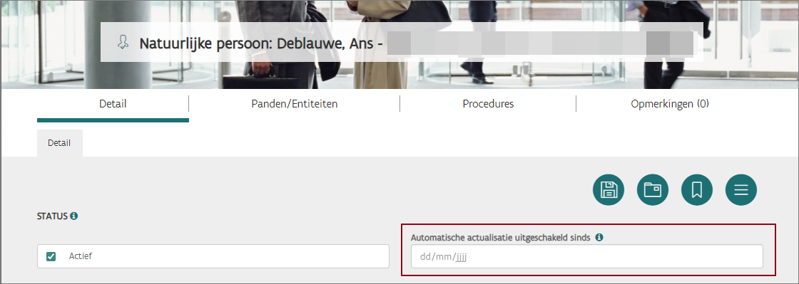 VLOK vult op Persoon > Detail het veld Automatische actualisatie uitgeschakeld sinds in met de datum van poging actualisatie. Iedereen die het detail kan bewerken, kan de automatische actualisatie terug aanzetten door de datum te verwijderen.