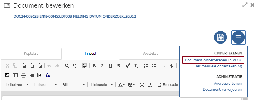 Uitzondering - De woningcontroleur ondertekent de verslagen van het conformiteitsonderzoek niet via de documentmodule maar via een actie in VLOK. Zie Hoe onderteken ik het onderzoek?