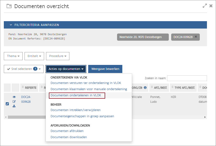 Ofwel selecteert u alle documenten die u wil ondertekenen en via Acties op documenten kiest u de actie Documenten ondertekenen in VLOK
