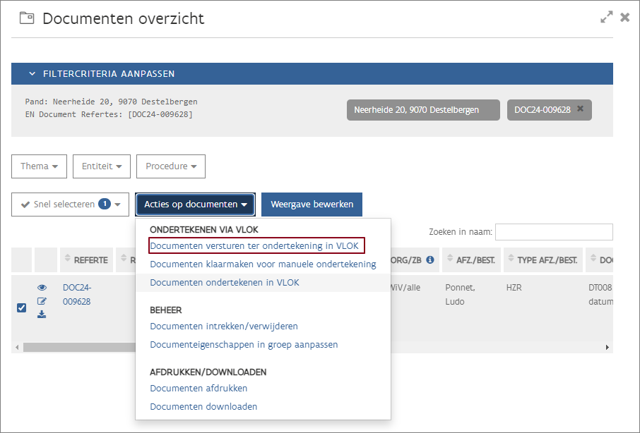 Documenten versturen ter ondertekening in VLOK via het actiemenu.