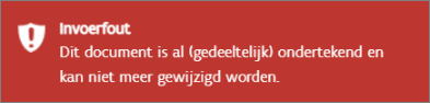 Van zodra minstens 1 handtekenveld is ondertekend is het niet langer mogelijk om het document te wijzigen. U krijg volgende foutmelding bij wijzigingspoging: