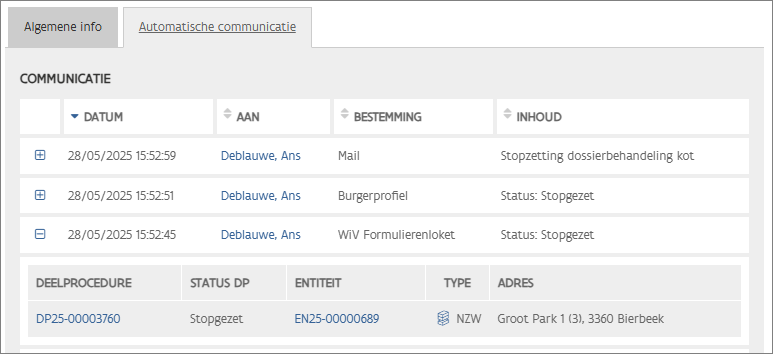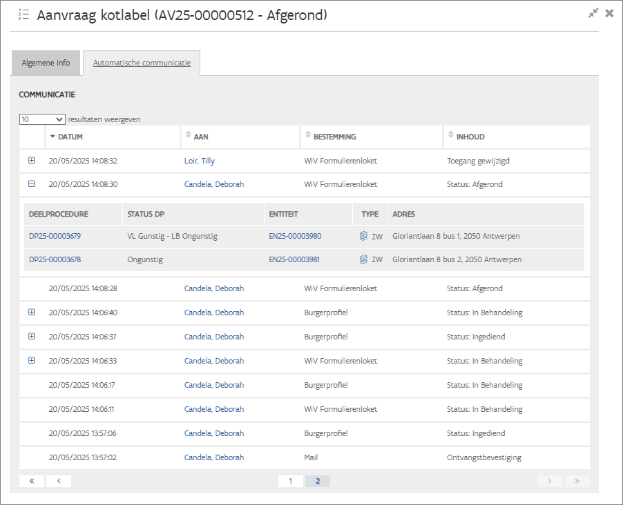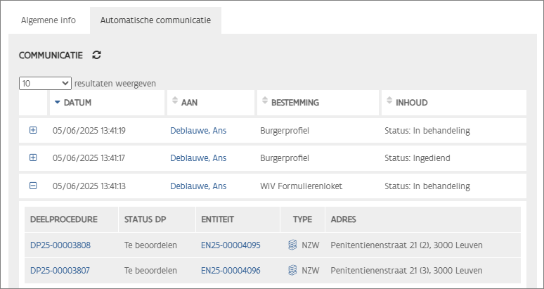 Van zodra de dossierbeheerder een beslissing neemt over een entiteit splitst in het formulierenloket de initiële aanvraag, die meerdere entiteiten kan bevatten, op naar dossiers per entiteit. Klik op + om weer te geven welke dossiers zijn betrokken in de communicatie.