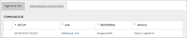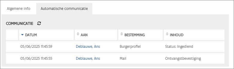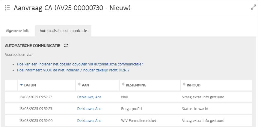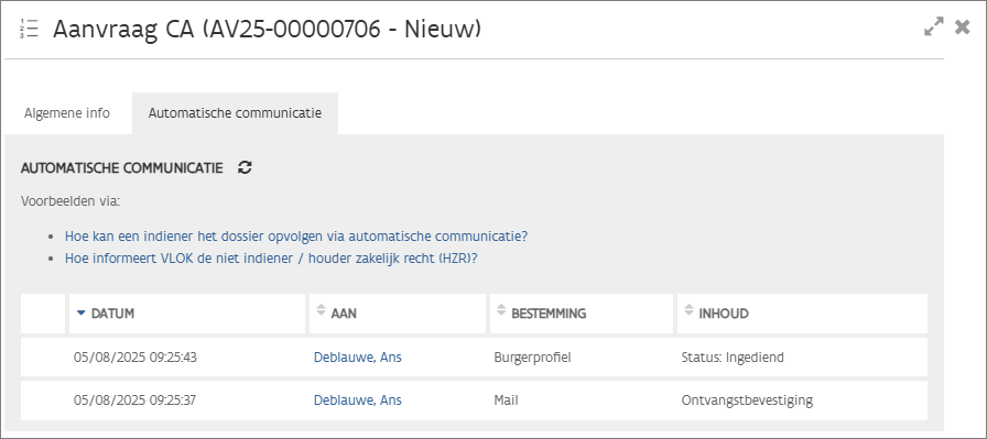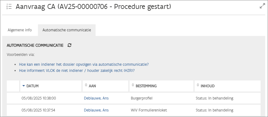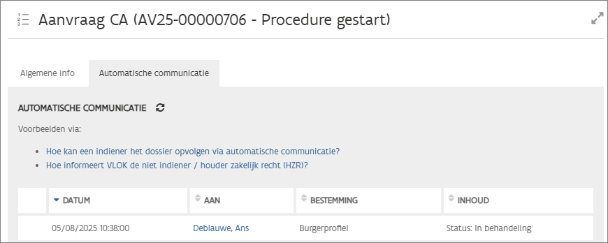 Om de dossierbeheerder (gemeente) te informeren over welke automatische communicatie is verstuurd, verzamelt VLOK de logginggegevens in een overzicht.