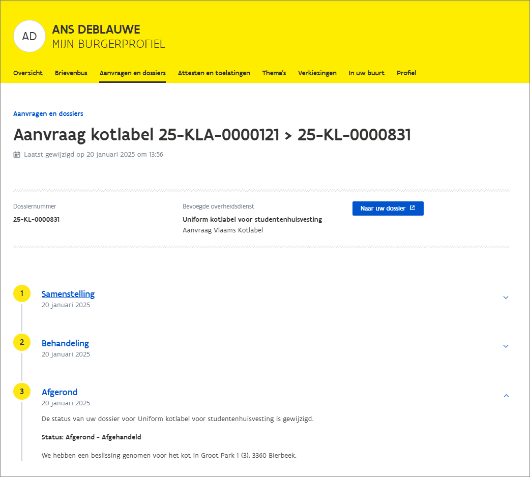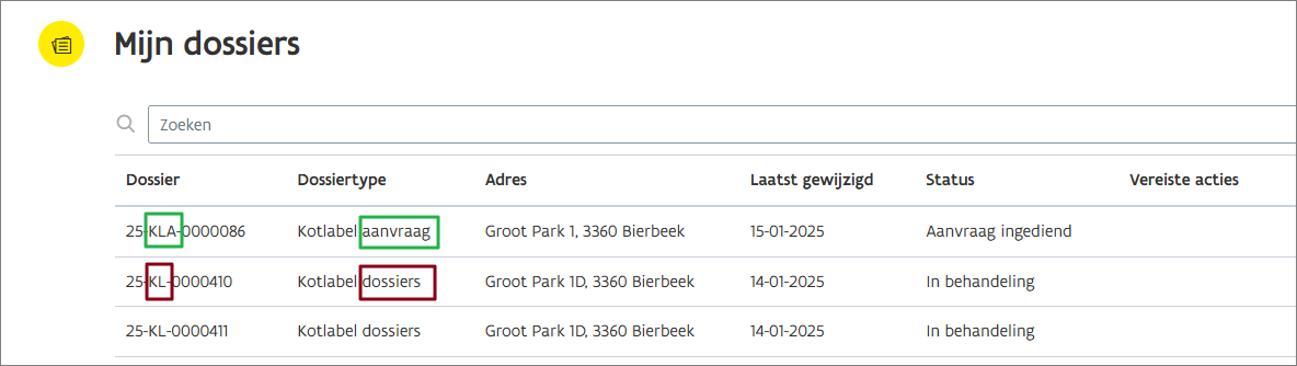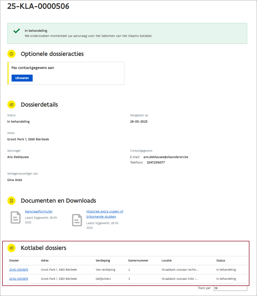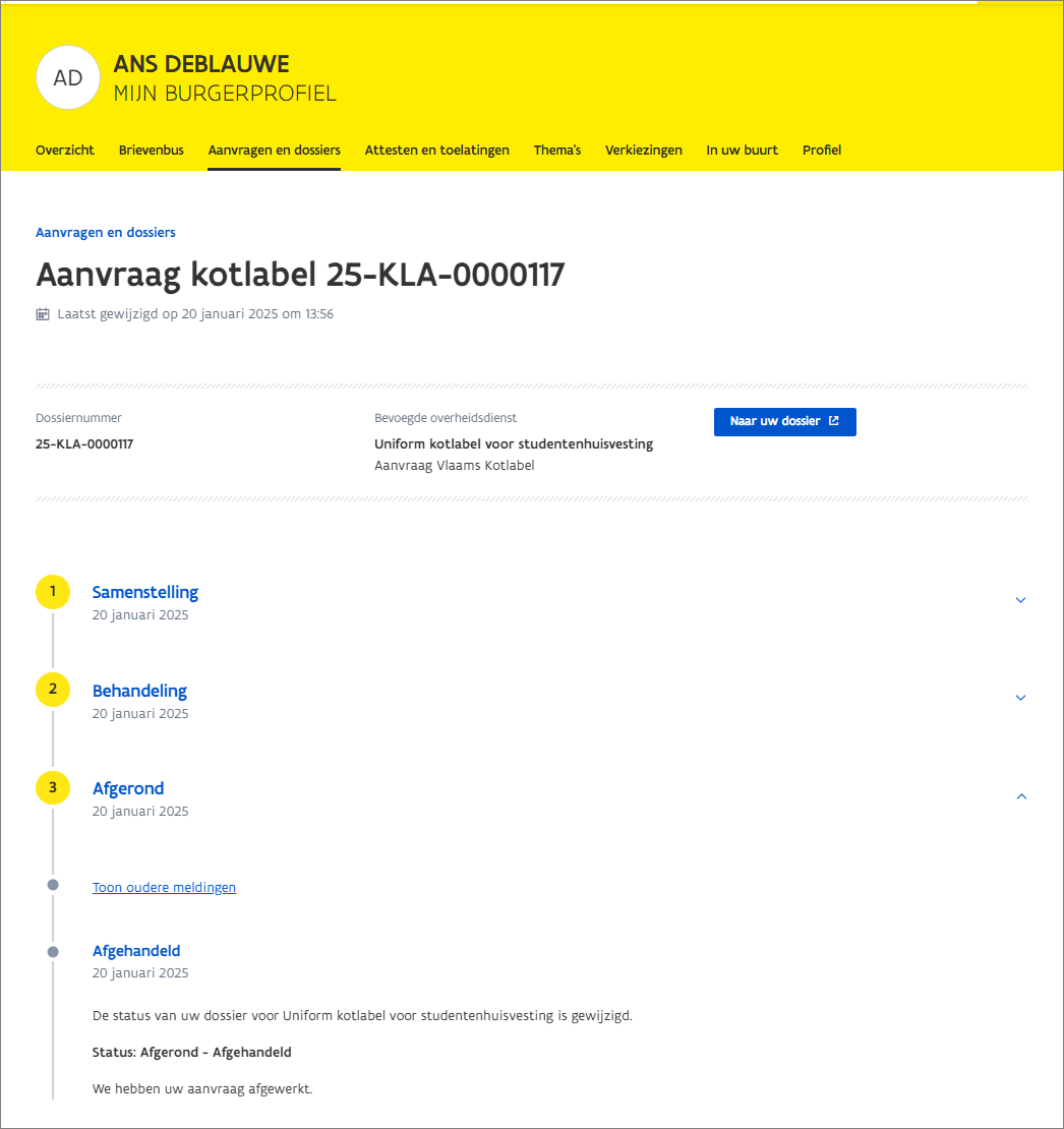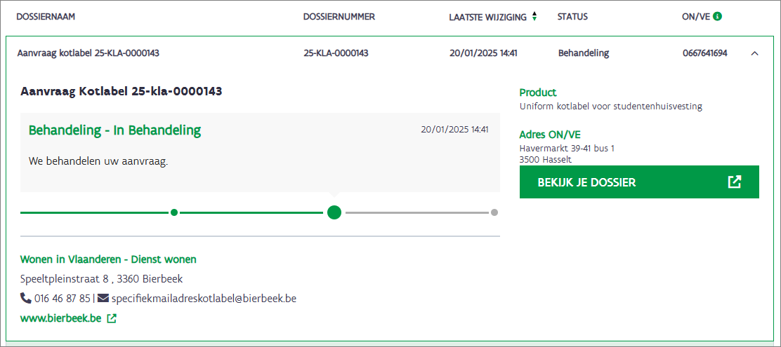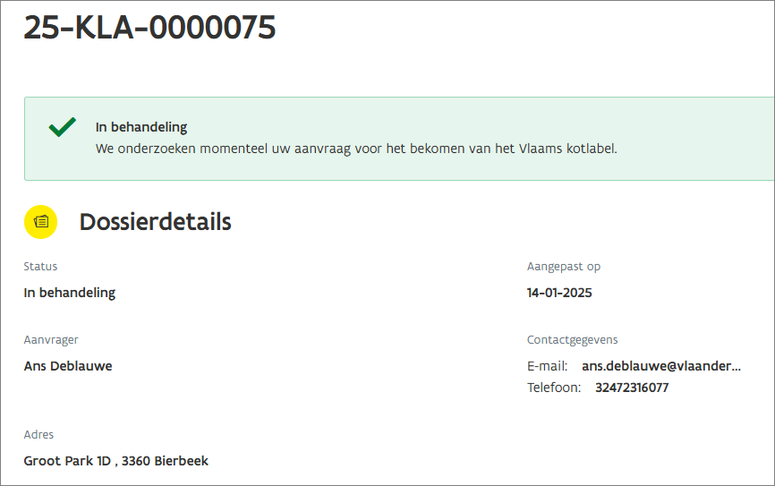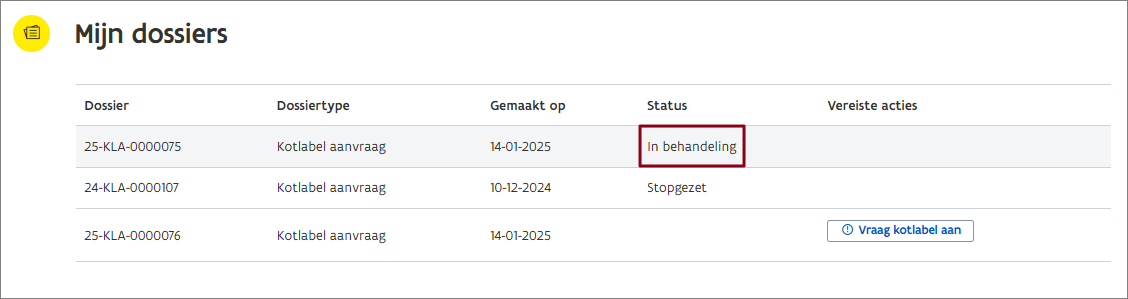 De status wijzigt wel naar In behandeling van zodra een dossierbehandelaar uw aanvraag koppelt aan een kotlabel procedure in VLOK