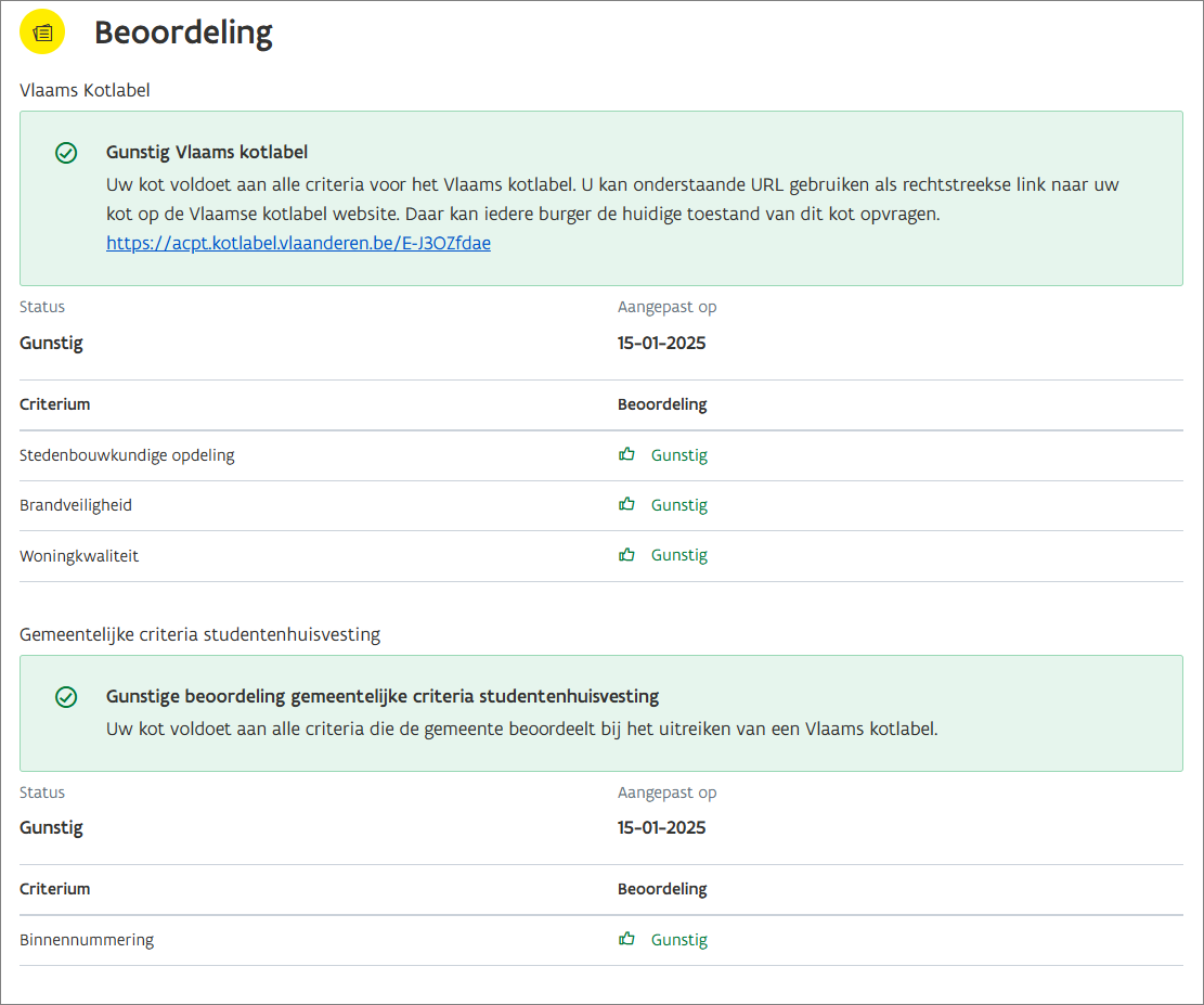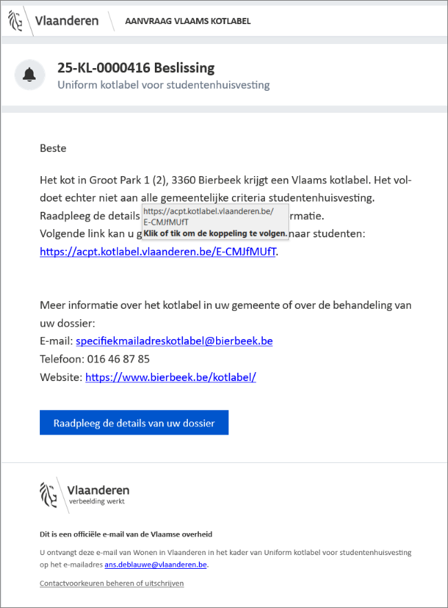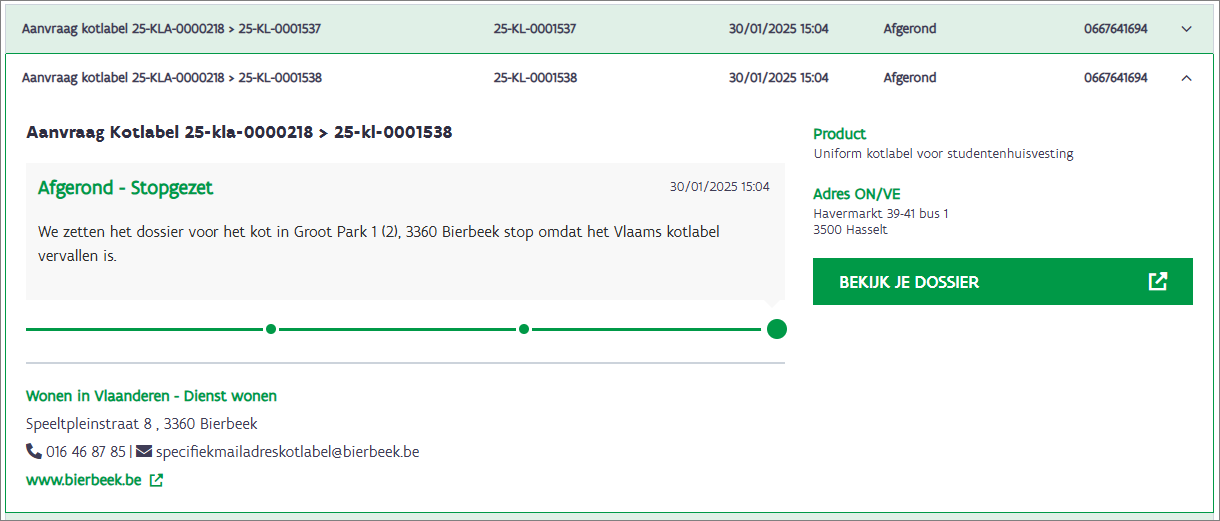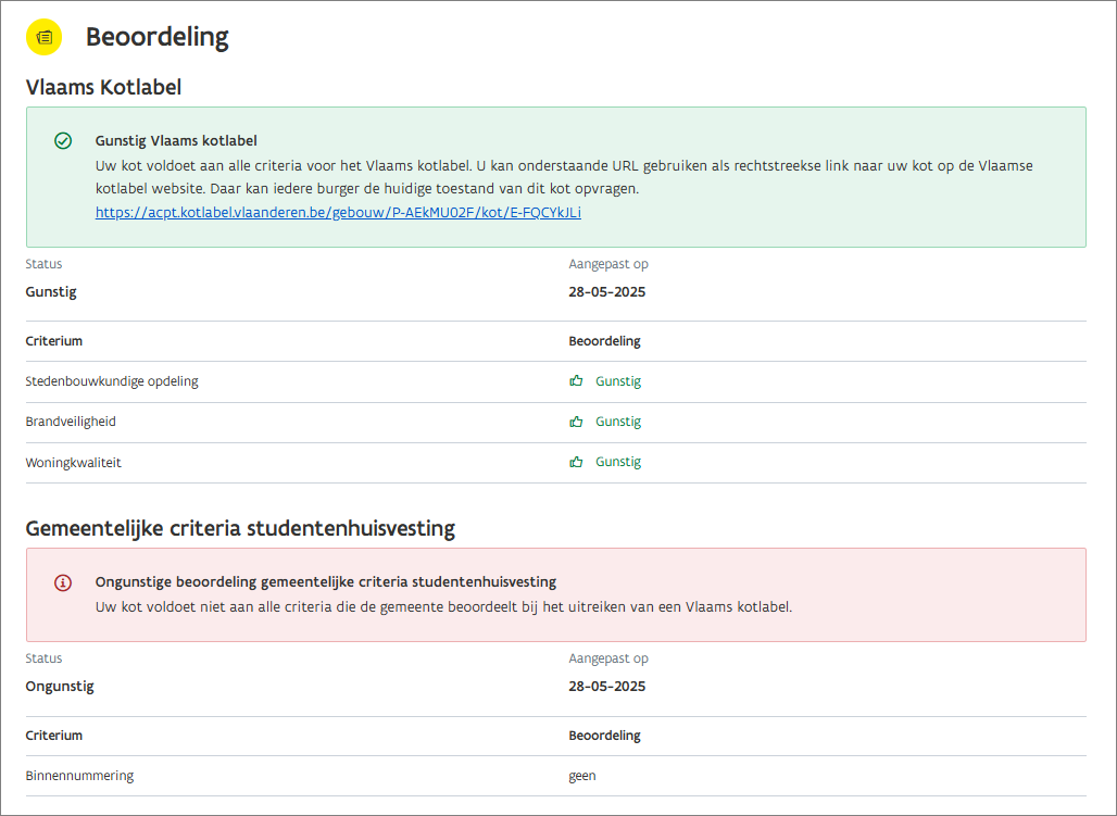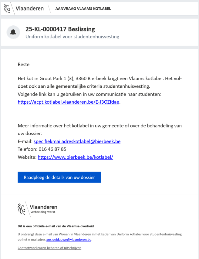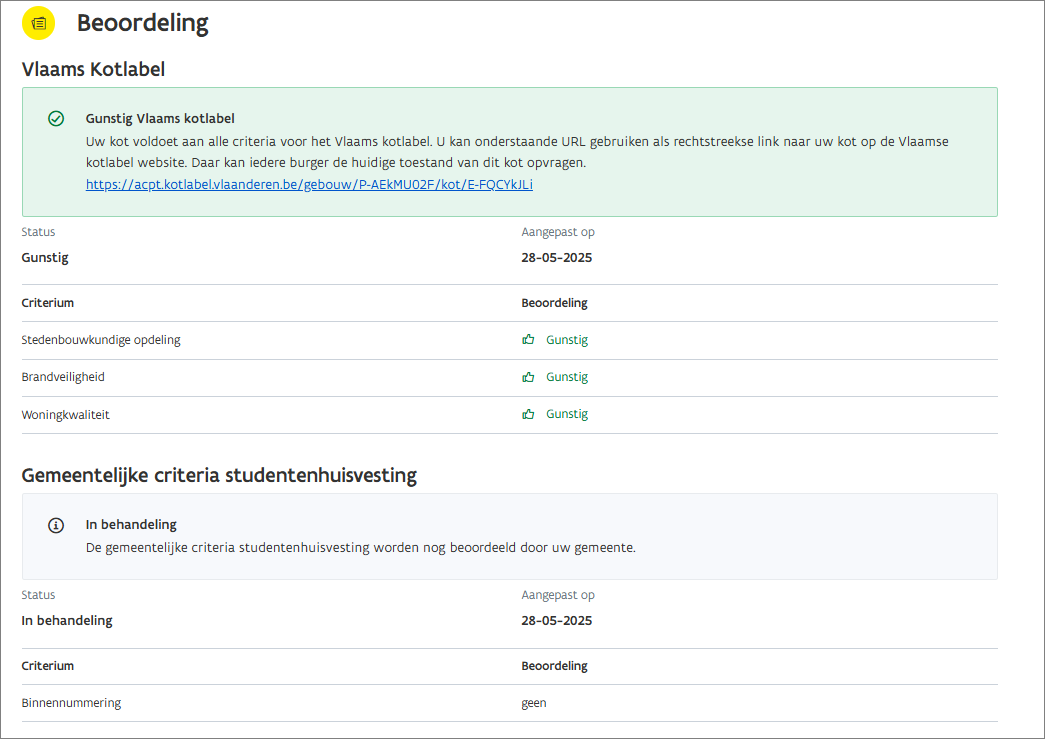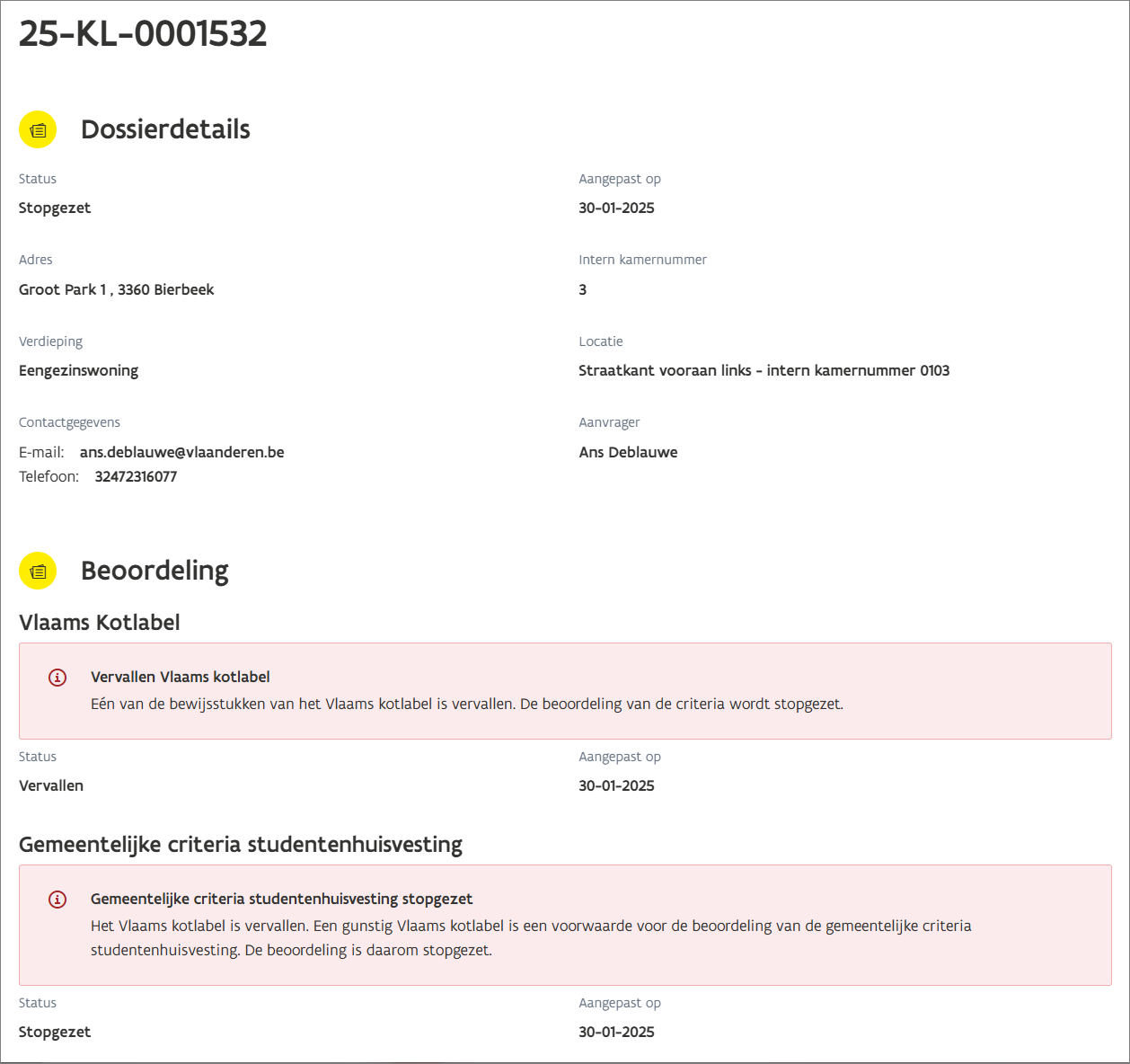 De details van een kot zijn pas zichtbaar nadat de dossierbehandelaar een kotlabel aanmaakt of weigert voor het kot.