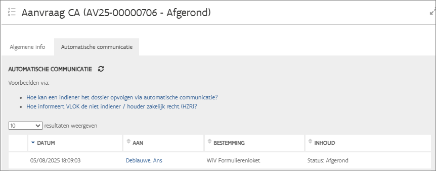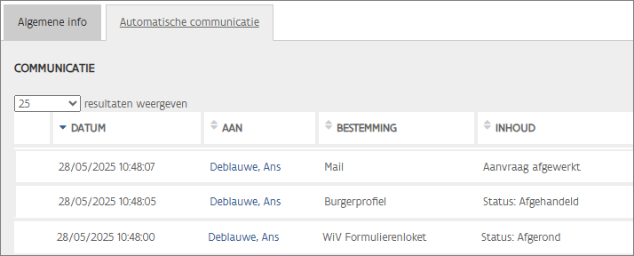 VLOK toont alle automatische communicatie in chronologische volgorde.