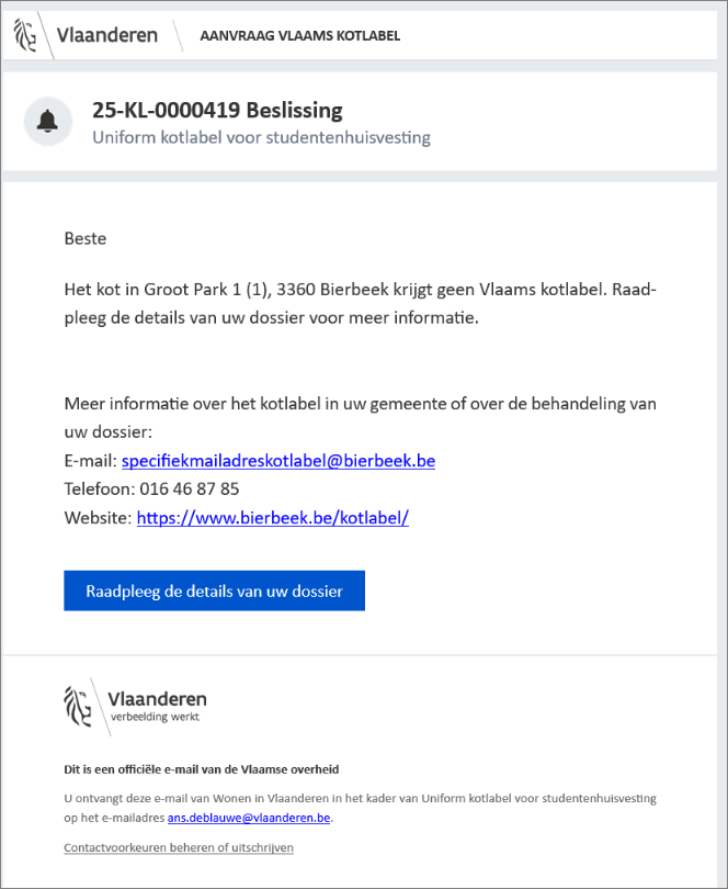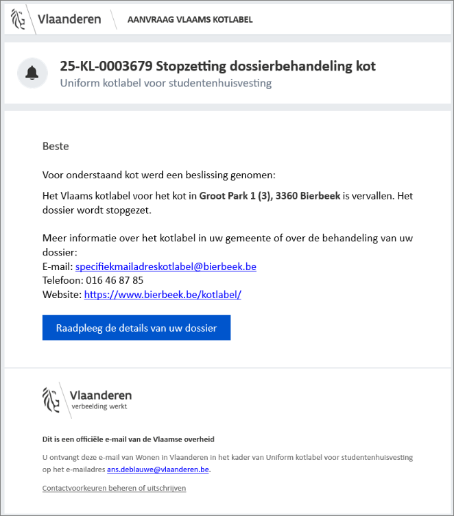 De indiener krijgt een kennisgevingsmail van stopzetting met vermelding van de reden.