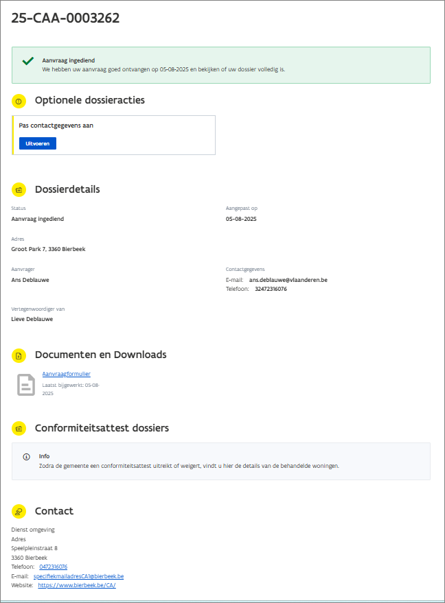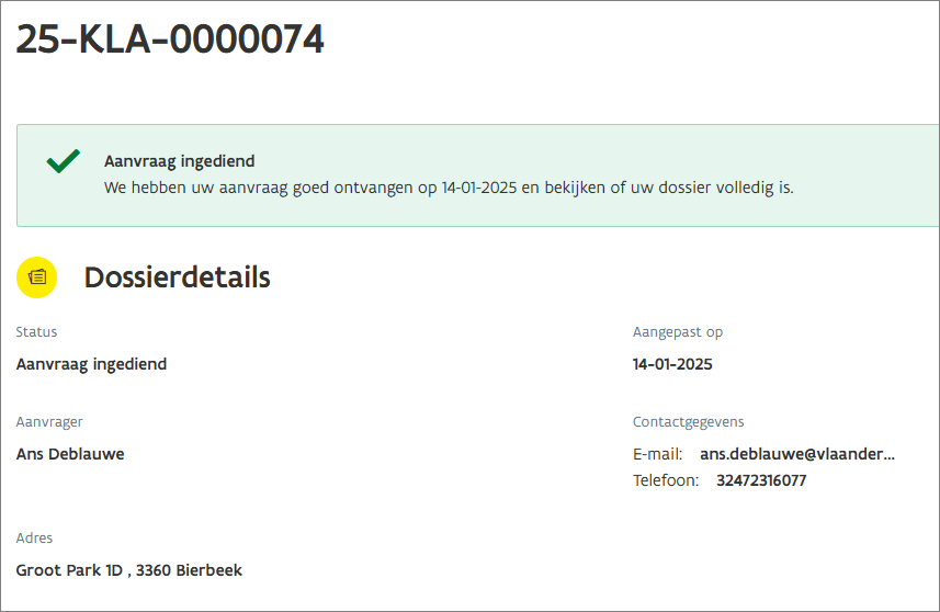Via het detail van de aanvraag kunt u opnieuw bekijken welke informatie u in de aanvraag hebt opgenomen: