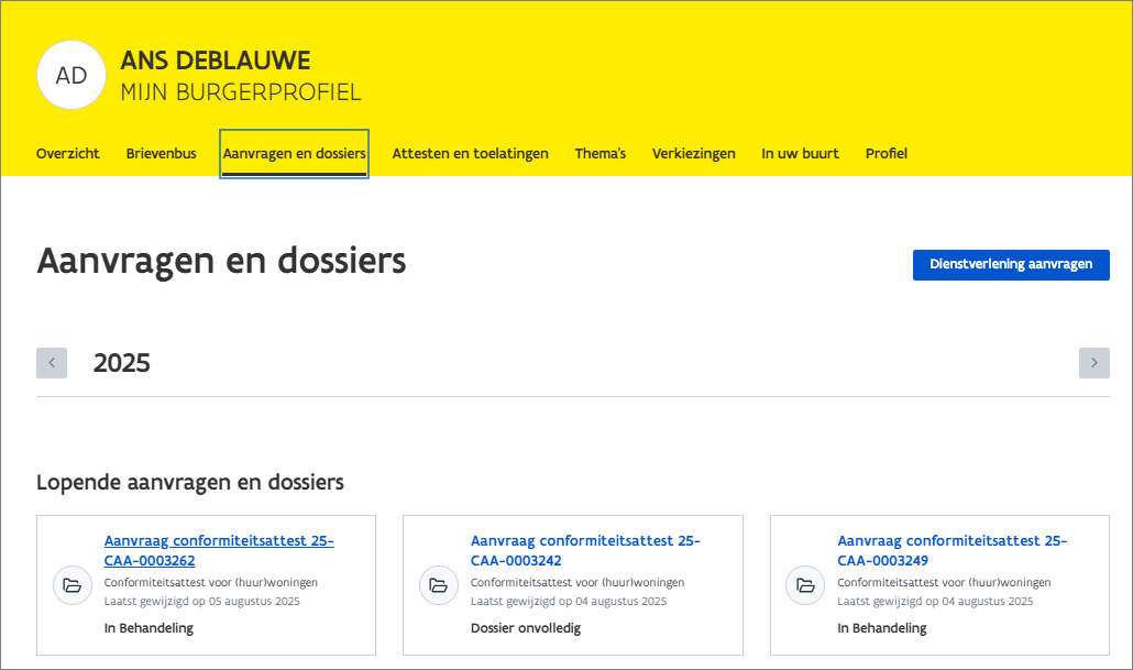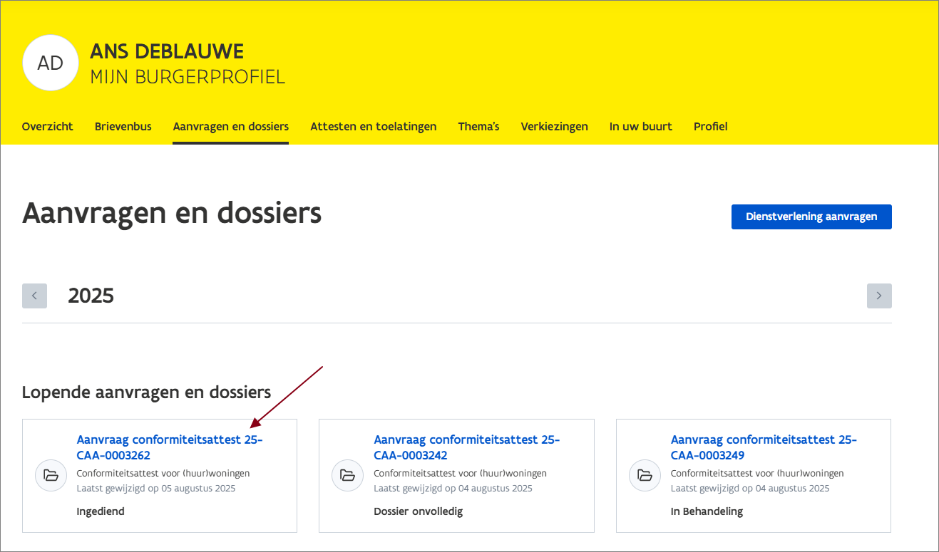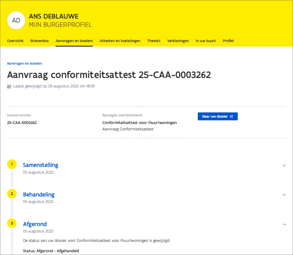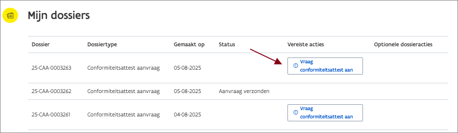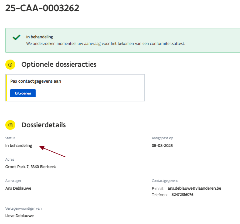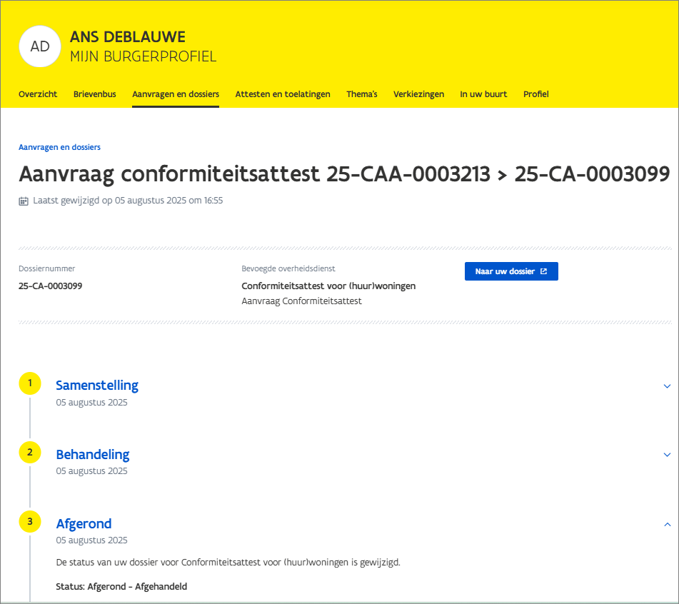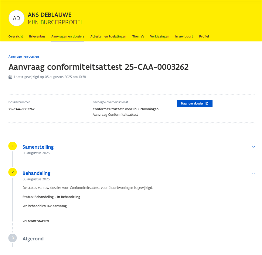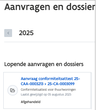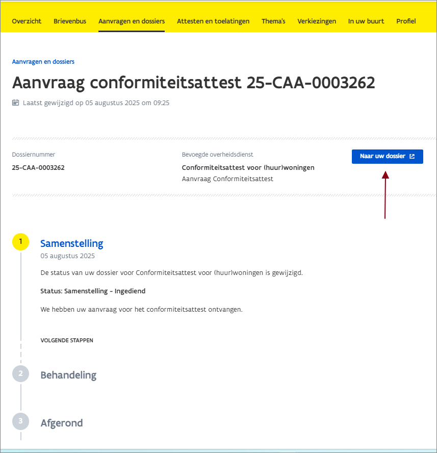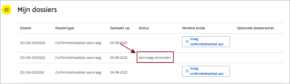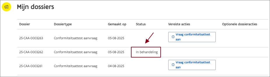 Na de bevestigingsmail, ziet u onder de tab Aanvragen en dossiers een nieuwe lopende aanvraag conformiteitsattest met status Samenstelling - Ingediend