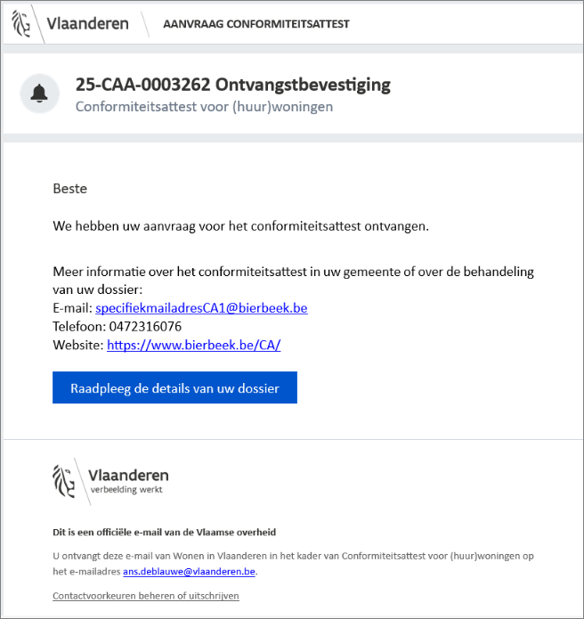 Zolang de aanvraag nog niet is verzonden bewaart het loket een voorlopige versie die u achteraf nog kan indienen via de actieknop 'Vraag conformiteitsattest Wie een woning in Vlaanderen verhuurt, moet ervoor zorgen dat deze volledig in orde is en voldoet aan bepaalde normen. Het conformiteitsattest (CA) is een officieel document dat de gemeente aflevert en dat aantoont dat uw woning aan de woningkwaliteitsnormen voldoet. In sommige gevallen kan ook Wonen in Vlaanderen een conformiteitsattest afleveren. Om na te gaan of een woning conform, veilig en gezond is, voert een woningcontroleur van de gemeente of van Wonen in Vlaanderen een conformiteitsonderzoek uit. Hij controleert de woning aan de hand van een technisch verslag.De woning krijgt een conformiteitsattest als ze niet ongeschikt of onbewoonbaar is en voldoende rookmelders heeft. aan'