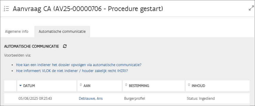 Hoe kan een indiener het dossier opvolgen via automatische communicatie?