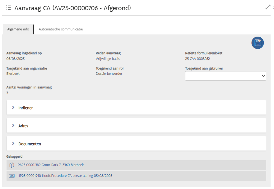 Het opsplitsen in dossiers kunt u erkennen aan + in VLOK > Automatische communicatie: