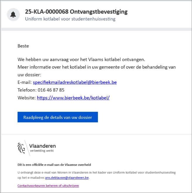 De aanvrager of vertegenwoordiger (indien vertegenwoordiging HZR) ontvangt een bevestigingsmail nadat VLOK de aanvraag heeft ontvangen:
