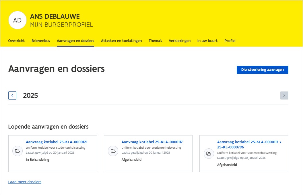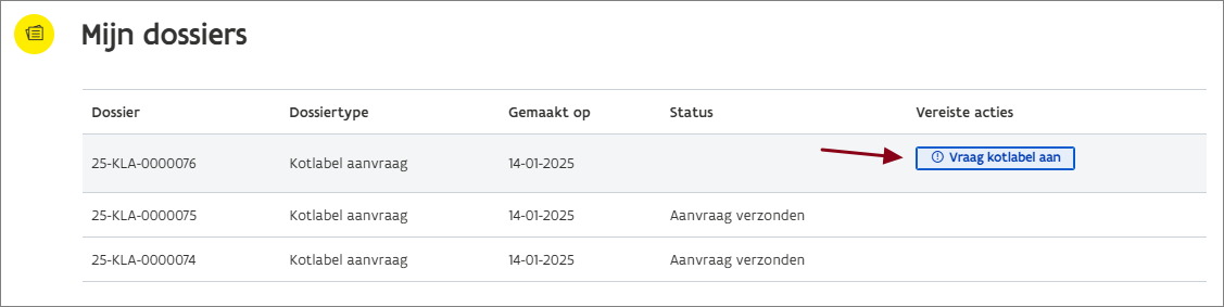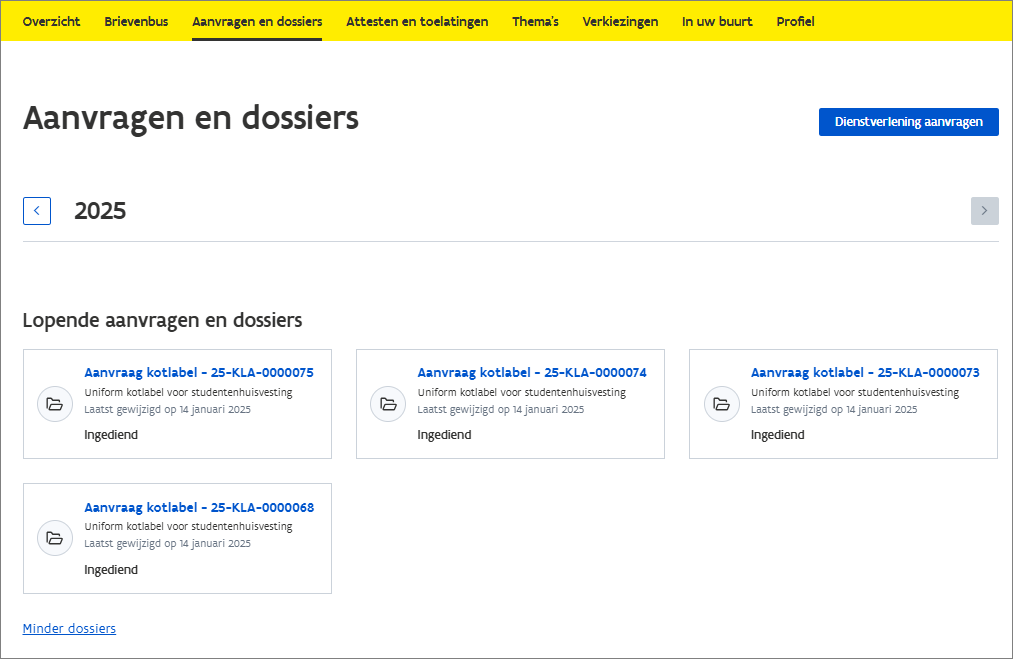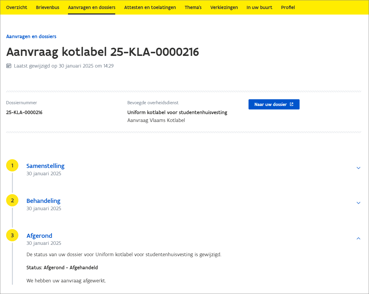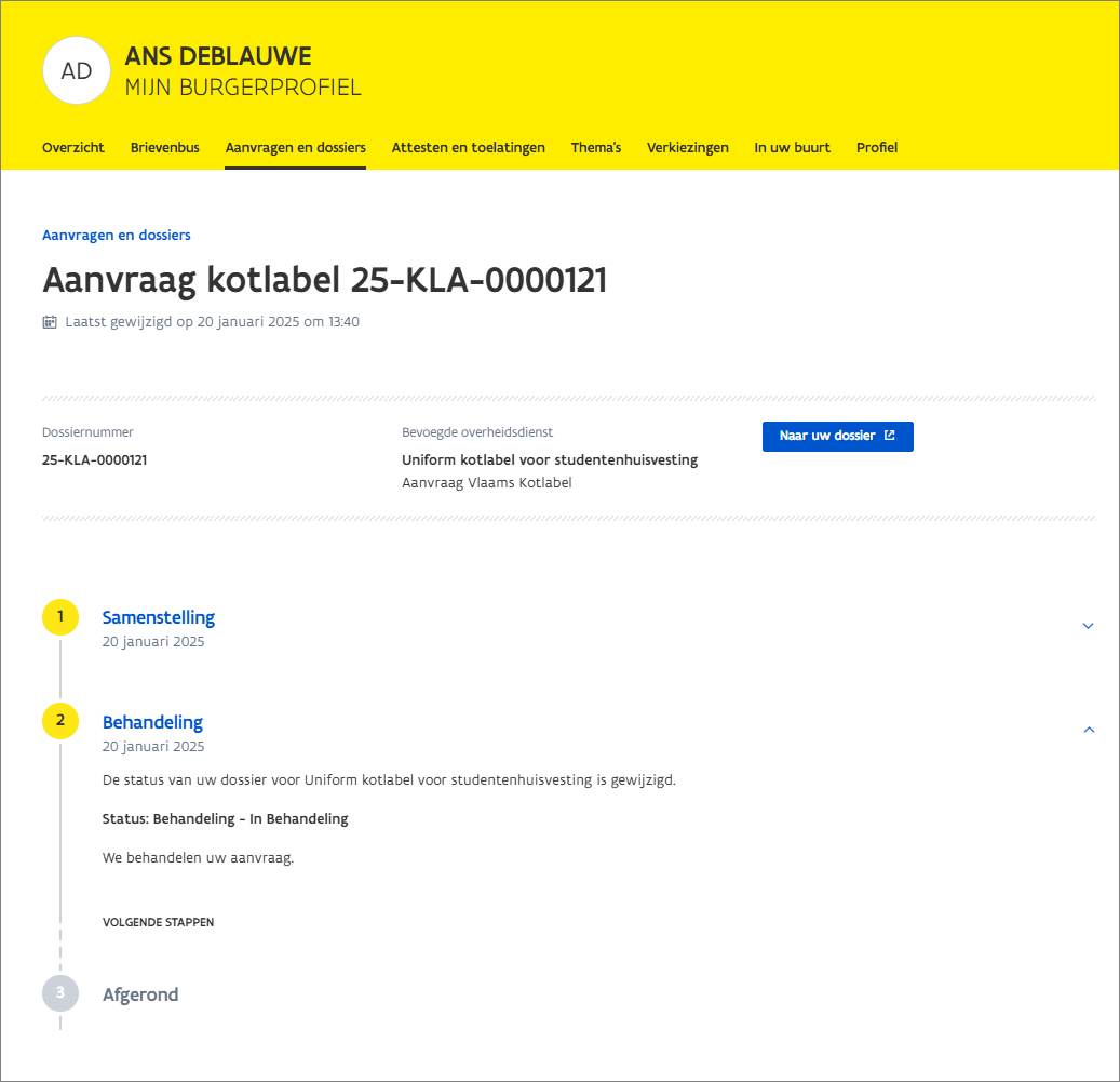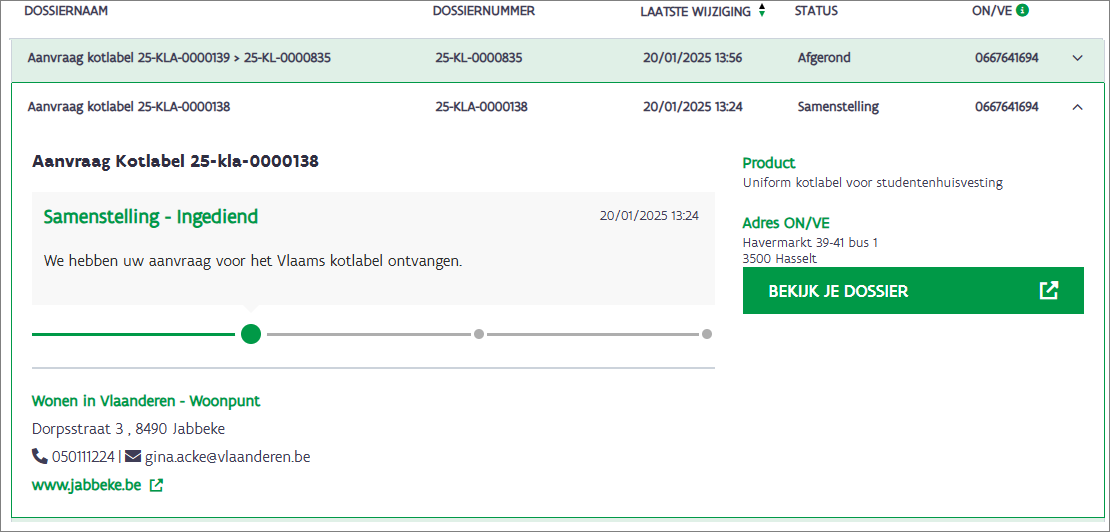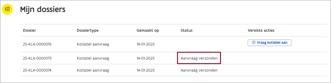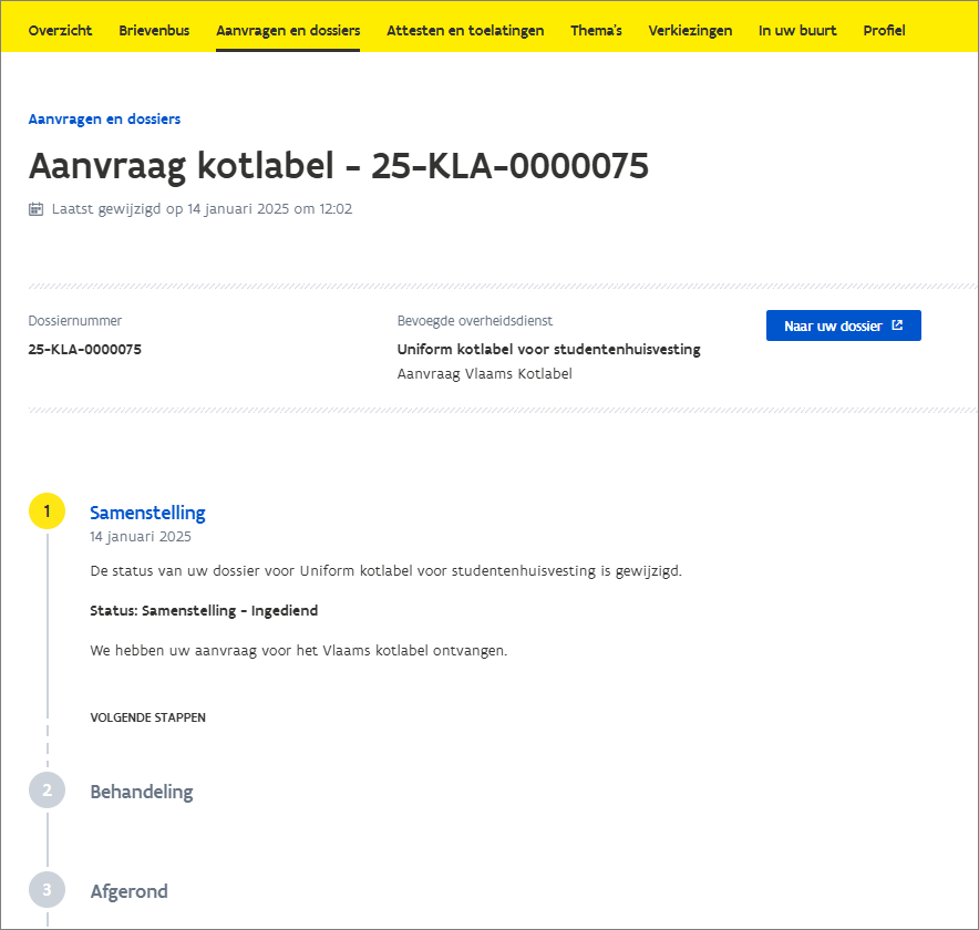 Na de bevestigingsmail, ziet u onder de tab Aanvragen en dossiers een nieuwe lopende aanvraag kotlabel met status Samenstelling - Ingediend