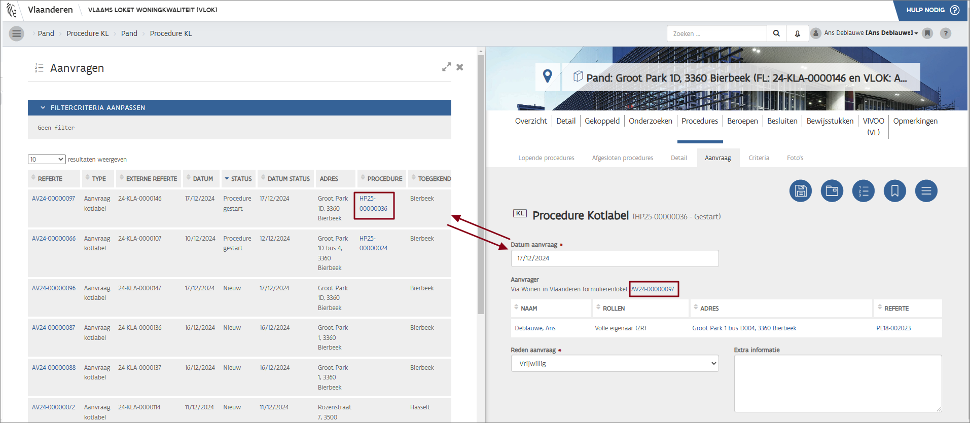 U kunt eenvoudig navigeren tussen aanvraag en procedure via de gekoppelde linken: