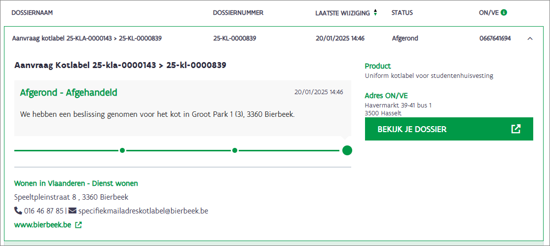 Klik op het dossier voor een detail van het dossier met een overzicht van de genomen beslissing. Voorbeelden: