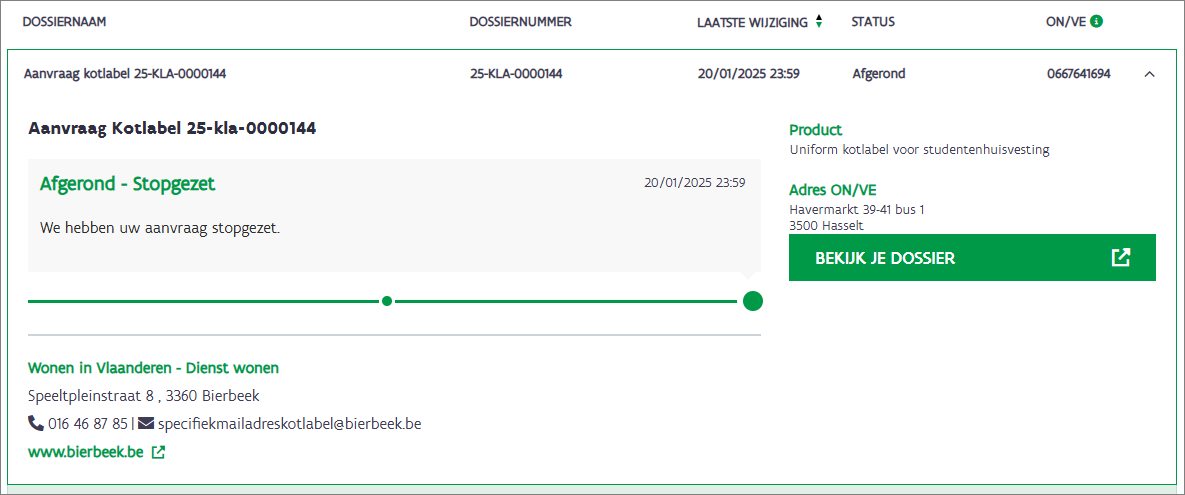 Bij verval Vlaamse kotlabel indien nog geen beslissing over gemeentelijke criteria wijzigt de status van het dossier naar Stopgezet.