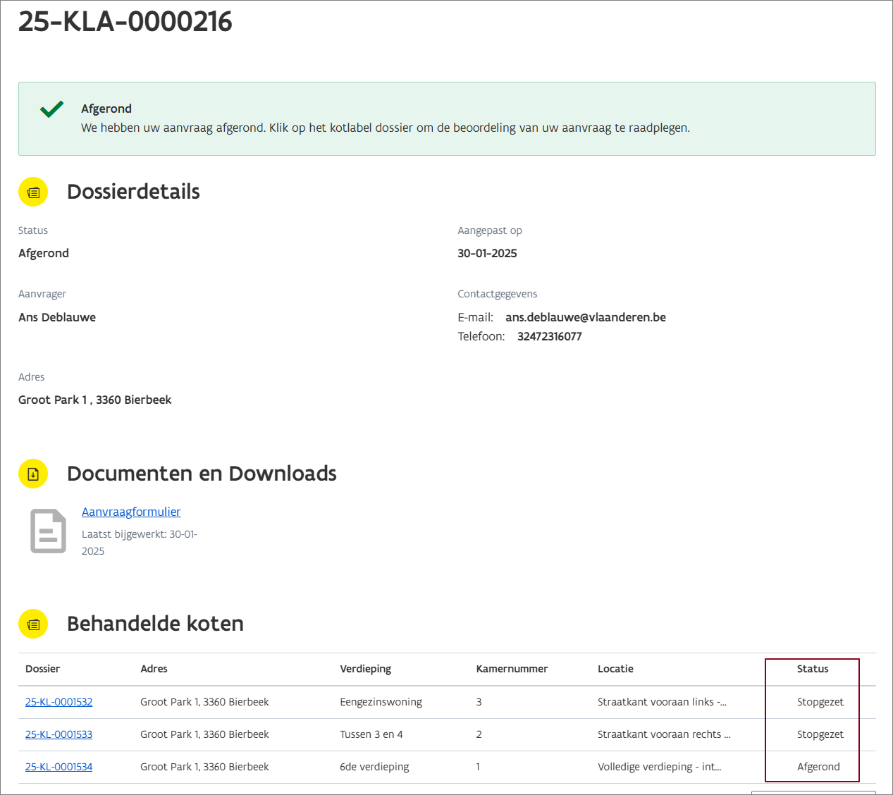 - De status van de initiële aanvraag wijzigt naar Afgerond zowel in VLOK als in het formulierenloket: