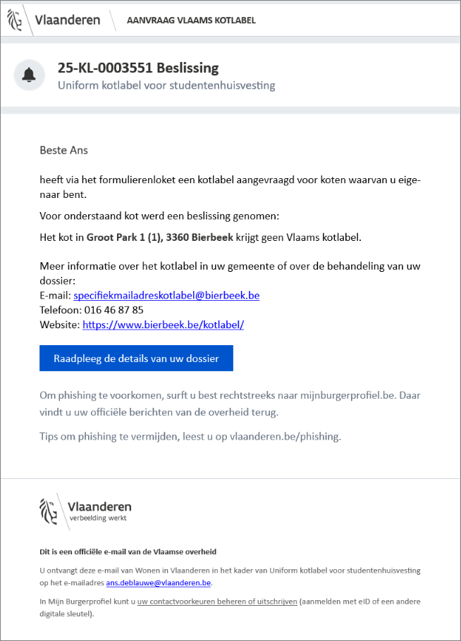 Voorbeelden kennisgevingsmails in procedure kotlabel: