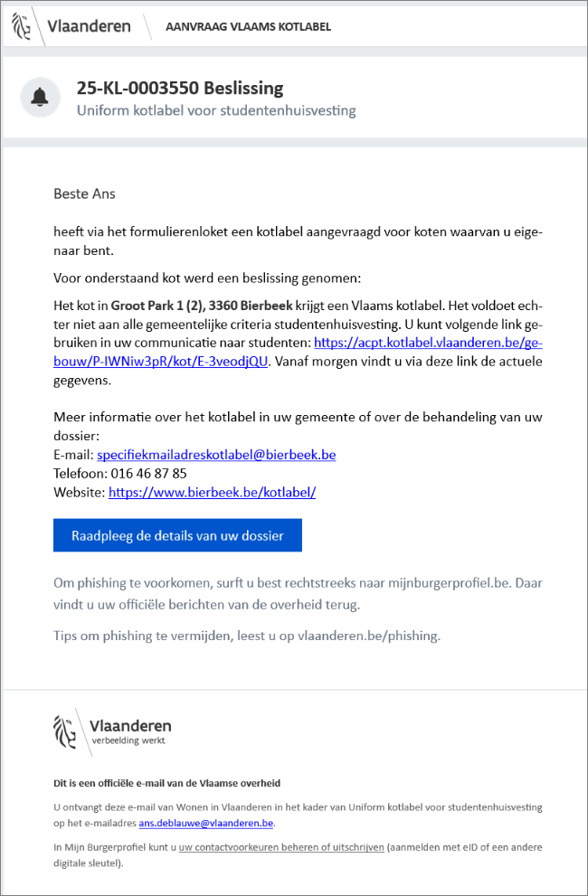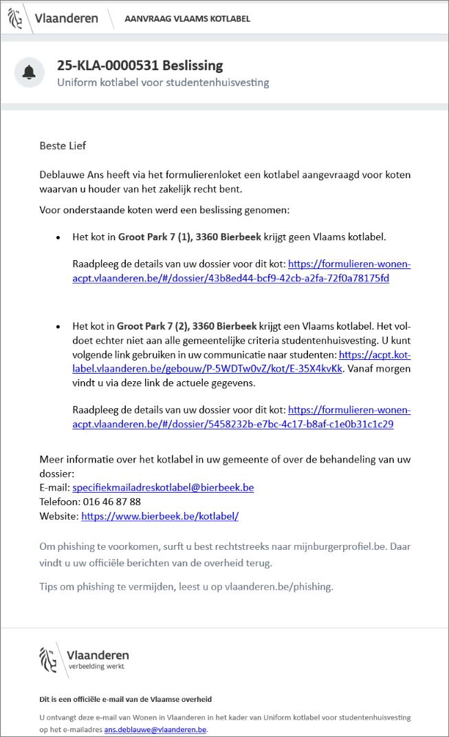 een automatische kennisgevingsmail met informatie over de beslissing kotlabel / conformiteitsattest Wie een woning in Vlaanderen verhuurt, moet ervoor zorgen dat deze volledig in orde is en voldoet aan bepaalde normen. Het conformiteitsattest (CA) is een officieel document dat de gemeente aflevert en dat aantoont dat uw woning aan de woningkwaliteitsnormen voldoet. In sommige gevallen kan ook Wonen in Vlaanderen een conformiteitsattest afleveren. Om na te gaan of een woning conform, veilig en gezond is, voert een woningcontroleur van de gemeente of van Wonen in Vlaanderen een conformiteitsonderzoek uit. Hij controleert de woning aan de hand van een technisch verslag.De woning krijgt een conformiteitsattest als ze niet ongeschikt of onbewoonbaar is en voldoende rookmelders heeft.. Om technische redenen ontvangen enkel de natuurlijke persoon deze mail en niet de rechtspersoon.