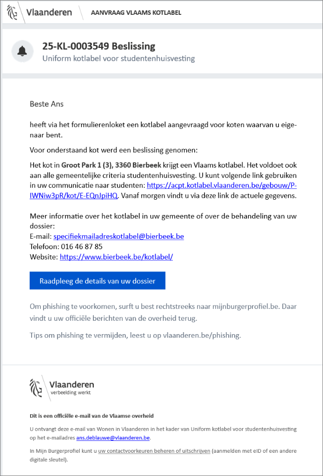 Om foutieve informatie te vermijden, zal VLOK de dossierbeheerder tijdens het aanmaken / weigeren van het kotlabel / conformiteitsattest in een tweede stap informeren wie de automatische notificatiemail zal ontvangen zodat de dossierbeheerder nog info van betrokkenen kan wijzigen indien nodig.