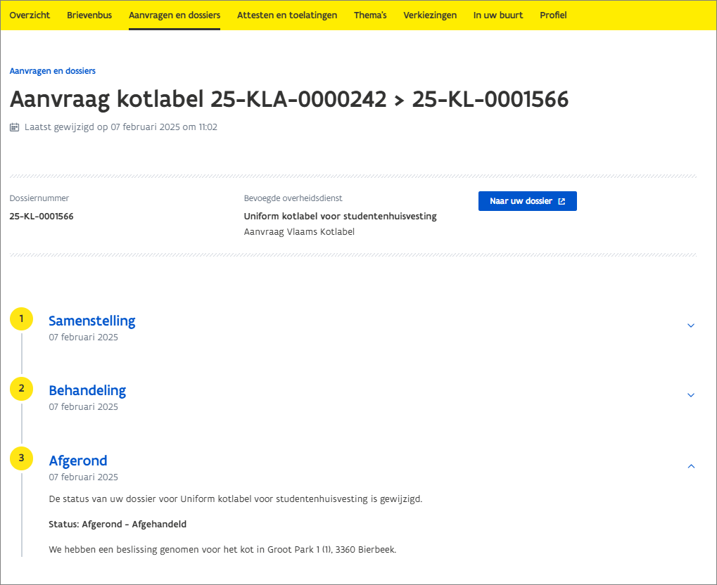 De status van het dossier wijzigt naar Afgerond