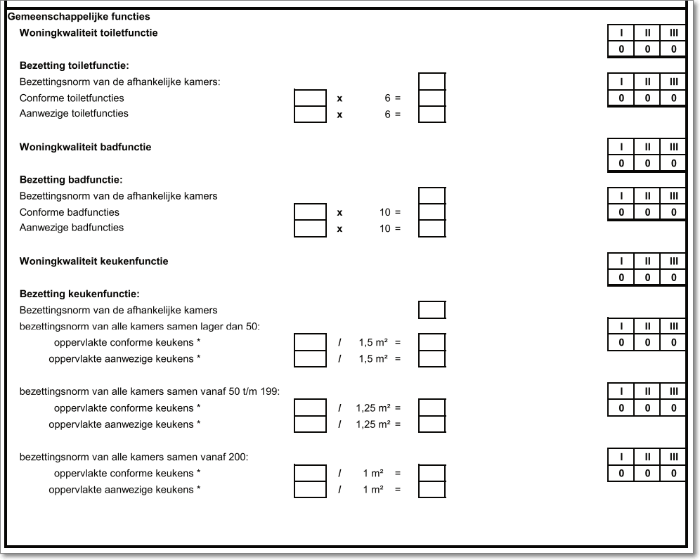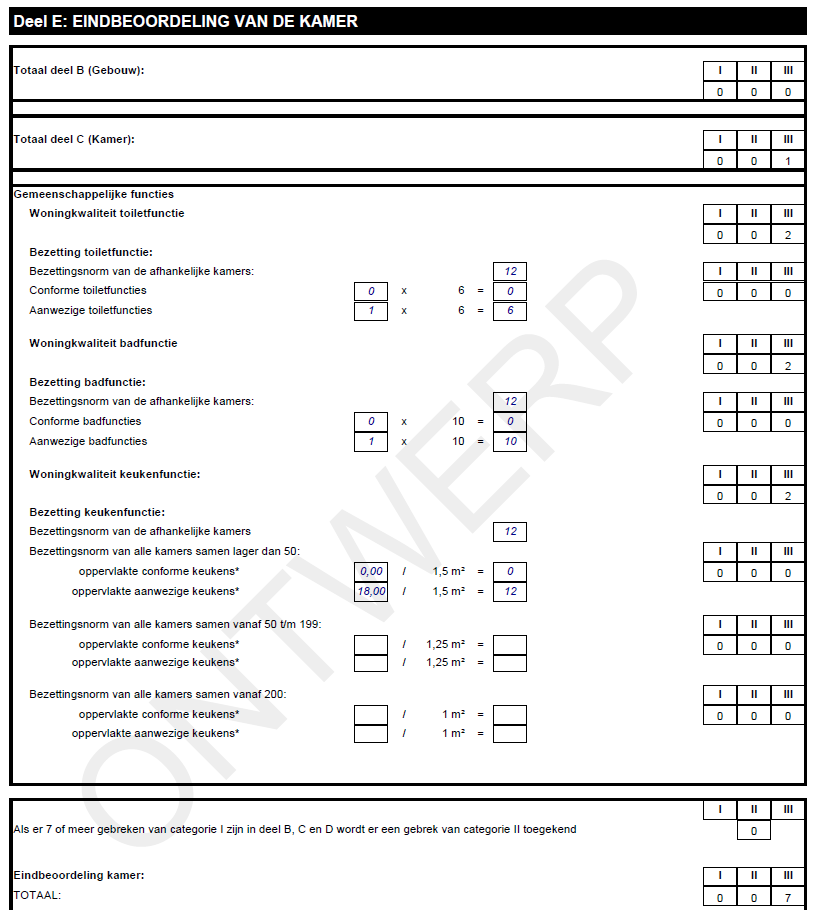 Voor de keukenfunctie telt de volledige oppervlakte van de keuken als conform als er geen enkel gebrek van categorie II of categorie III in deel lokaal voorkomt en er minstens 1 kookhoek is met geen enkel gebrek van categorie II of III en maximum 6 gebreken van categorie I in deel lokaal en kookhoek samen. - Een ongeschikte woning is een woning met minstens één gebrek van categorie II of III