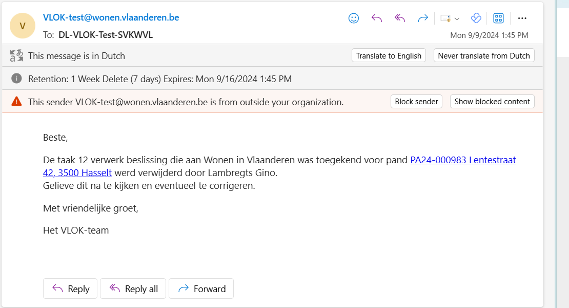 Als de gemeente per ongeluk deze taak toch zou verwijderen, maakt VLOK volgende kennisgevingsmail voor de generieke mailadressen van de regio's zodat de dossierbeheerder woningkwaliteit (Wonen) alsnog de besluiten kan valideren en de entiteiten Een entiteit is een deel van een pand. Er zijn 3 entiteitstypes: niet-woonfunctie (NWF), een niet-zelfstandige woning (NZW) en een zelfstandige woning (ZW). Zie voor uitgebreide definitie' Hoe voeg ik een nieuwe entiteit toe?', indien nodig, kan opnemen op VIVOO De Vlaamse inventaris voor ongeschikte en onbewoonbare woningen (VIVOO) bevat: • een lijst met de ongeschikt- en onbewoonbaarverklaringen Vlaamse Wooncode (VIVOO-OO) • een aparte lijst met de onbewoonbaarverklaringen Nieuwe Gemeentewet (VIVOO-NGW) Een besluit tot overbewoning geeft geen aanleiding tot opname in de Vlaamse inventaris..