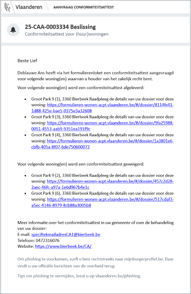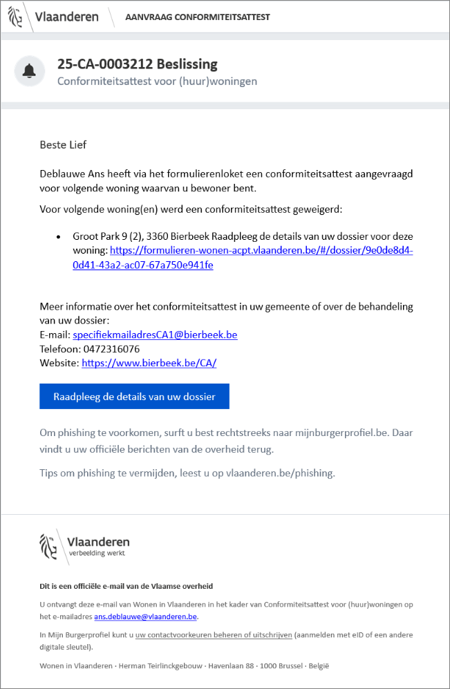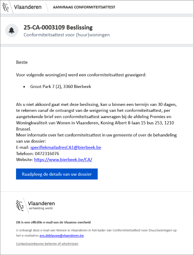 <indien reden weigering = OG Ongeschikt. Dit is een mogelijk resultaat voor een entiteit in een onderzoek, advies of beslissing van de burgemeester. of OG/OB Ongeschikt en onbewoonbaar. Dit is een mogelijk resultaat voor een entiteit in een onderzoek, advies of beslissing van de burgemeester.>Op basis van het onderzoek <referte onderzoek als link> van <datum onderzoek> werd het CA geweigerd voor <adres entiteit - verdieping - locatie> met reden <reden weigering>. Via de referte kan u het onderzoek bekijken als u toegang heeft tot VLOK.