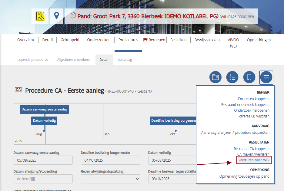 Navigeer via het detail van uw taak naar de hoofdprocedure of (Pand Elk bebouwd onroerend goed dat zowel het hoofdgebouw als de bijgebouwen omvat (= gebouwen die als 1 geheel beschouwd kunnen worden), met uitzondering van bedrijfsruimten. Een pand kan één of meerdere zelfstandige en/of niet-zelfstandige entiteiten bevatten met of zonder woonfunctie. > Procedures (OO/CA) > Detail) en llik op de actie Resultaten: Versturen naar WiV of gemeente of Beslissing/CA versturen naar WiV via in de hoofdprocedure.