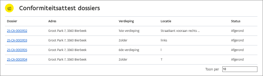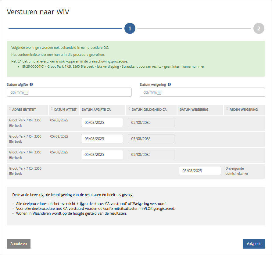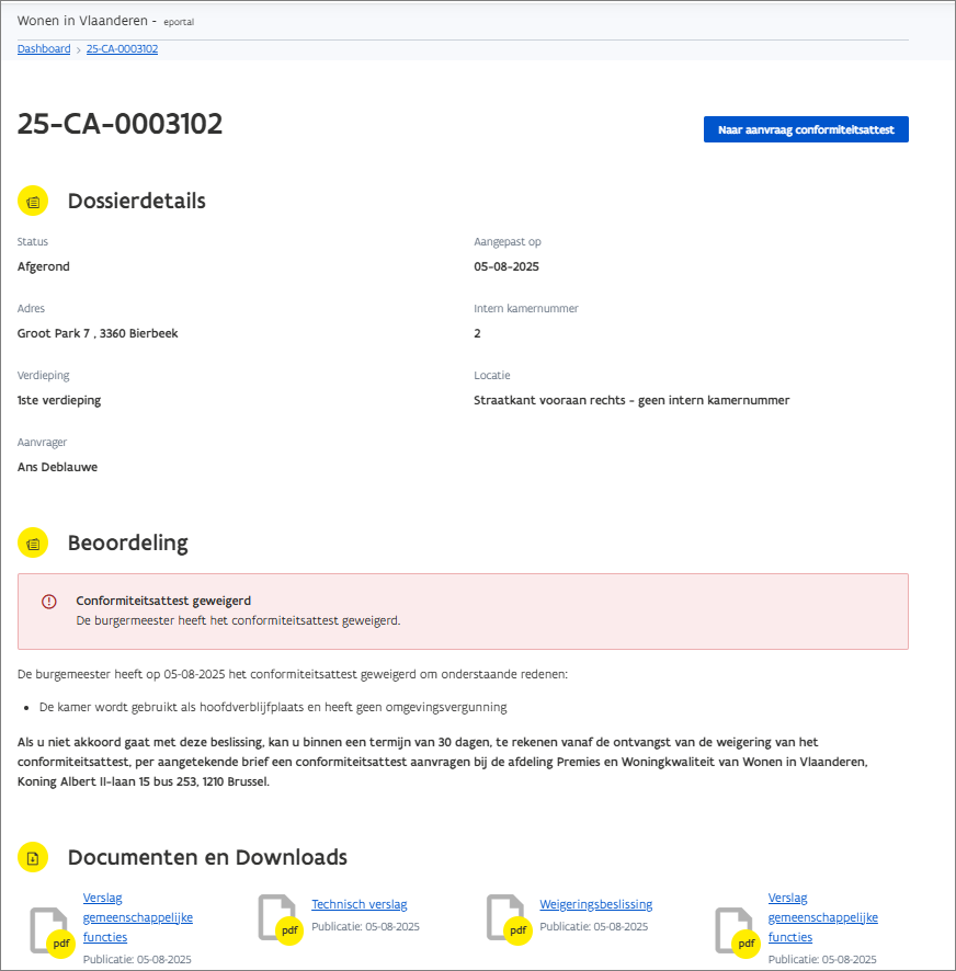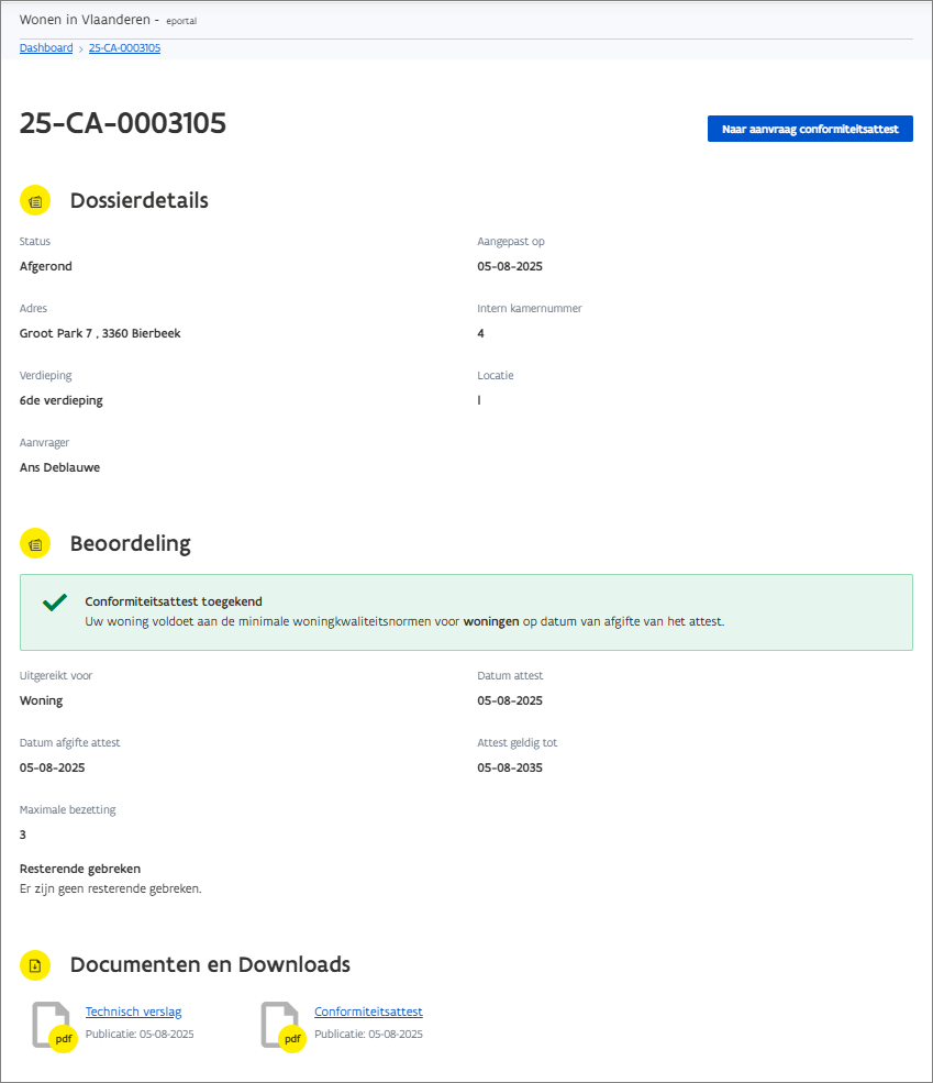 Voor de kamerwoningen worden enkel de conformiteitsattesten en weigeringsbrieven via mail verstuurd. De bijhorende technische verslagen moet u in Vlok downloaden en zelf bezorgen aan de WM. -