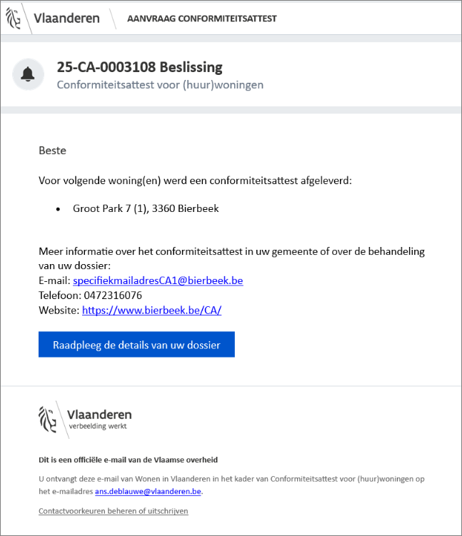 162 kennisgeving CA aan eigenaar/verhuurder toegekend aan de dossierbeheerder (gemeente)