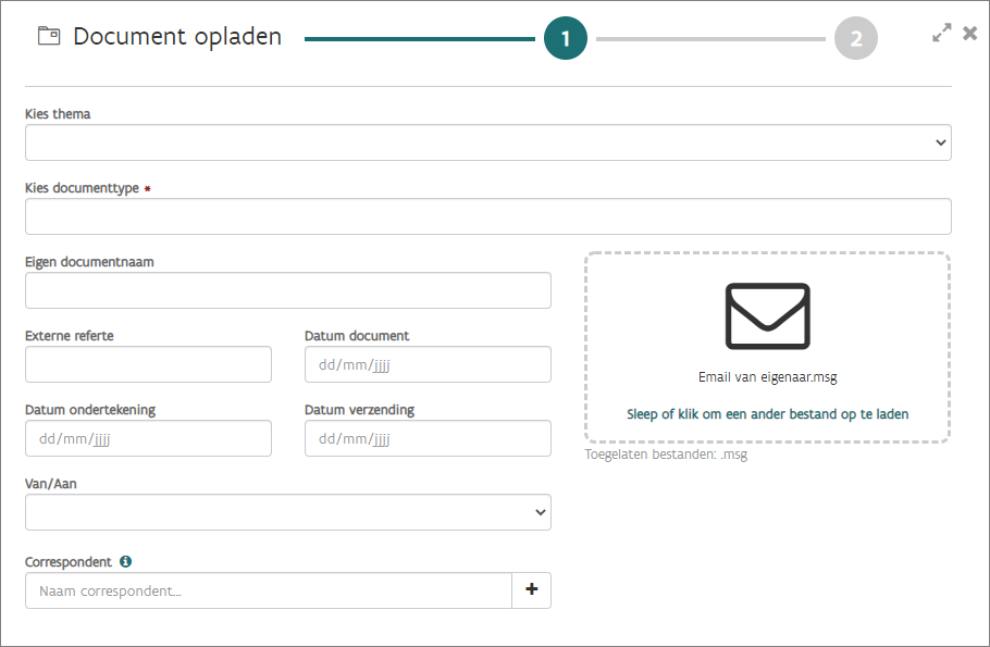 • Het is mogelijk om zowel pdf, mails (msg) als dwg bestanden op te laden afhankelijk van het documenttype.
